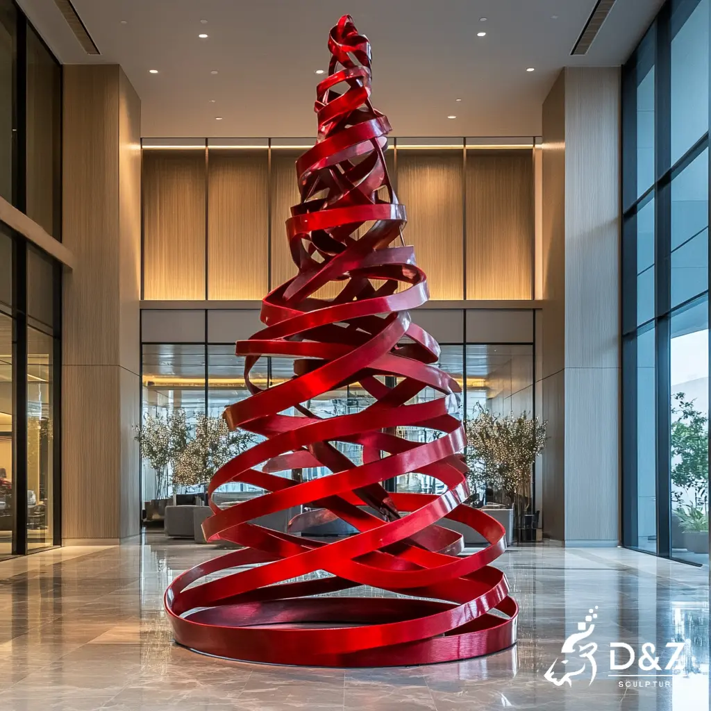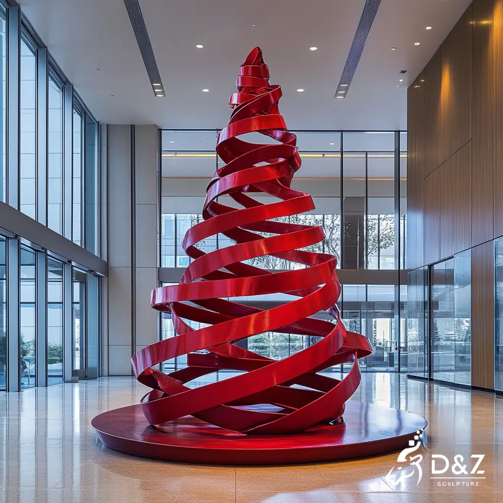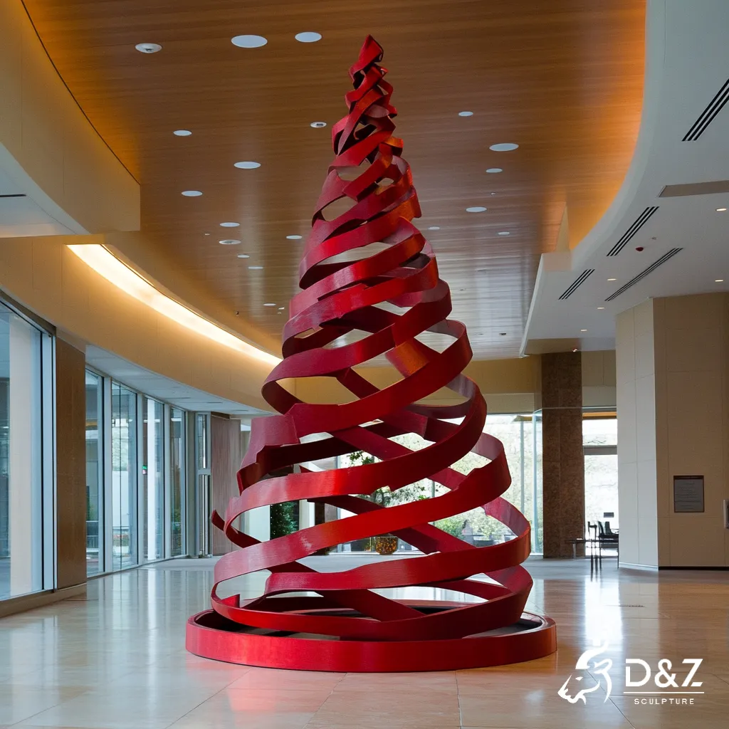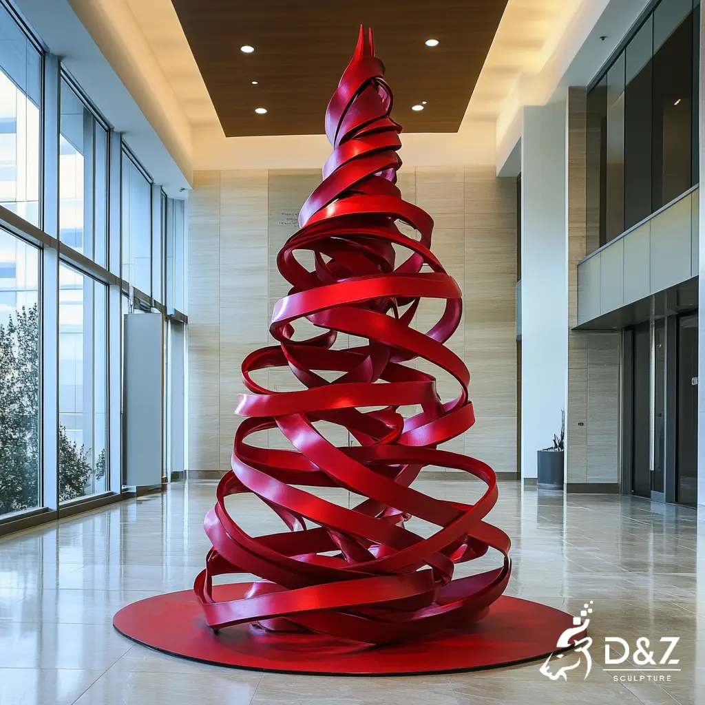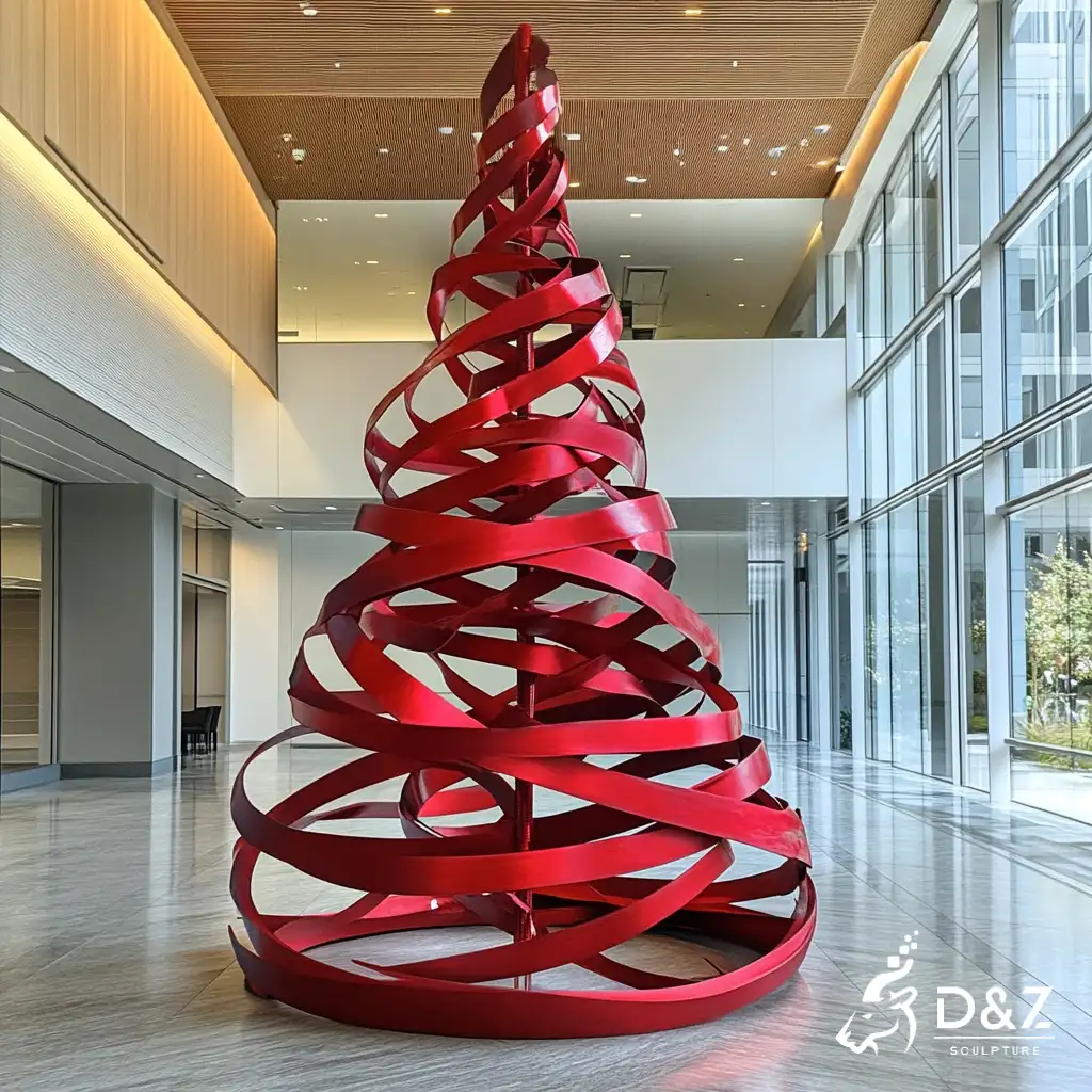 This work is a striking abstract Christmas tree sculpture crafted from metal, shaped as red ribbons. It elevates indoor/outdoor spaces (lobbies, plazas) with modern, artistic holiday charm.