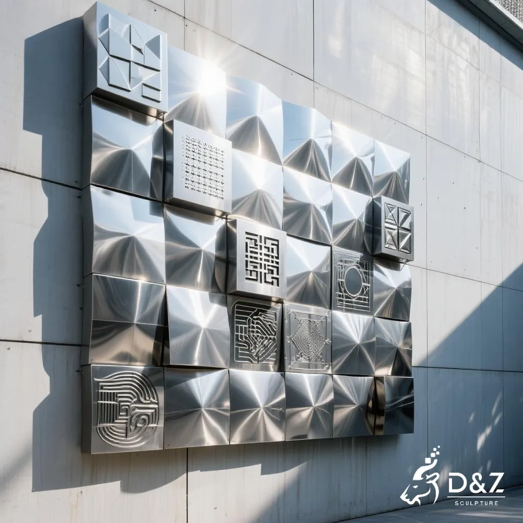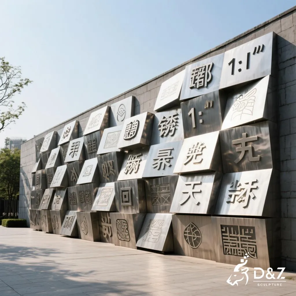 This brick wall sculpture seamlessly combines art, culture, and modern design in a single striking installation. The sculpture is made from premium stainless steel panels shaped like three-dimensional bricks, each engraved with characters, patterns, or abstract symbols. Its polished metallic surface reflects light beautifully, adding both depth and sophistication to architectural facades.