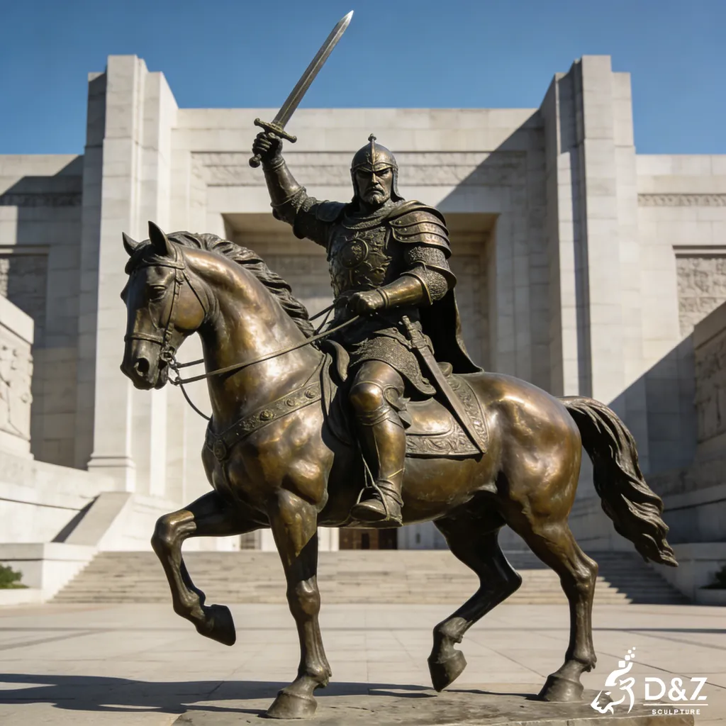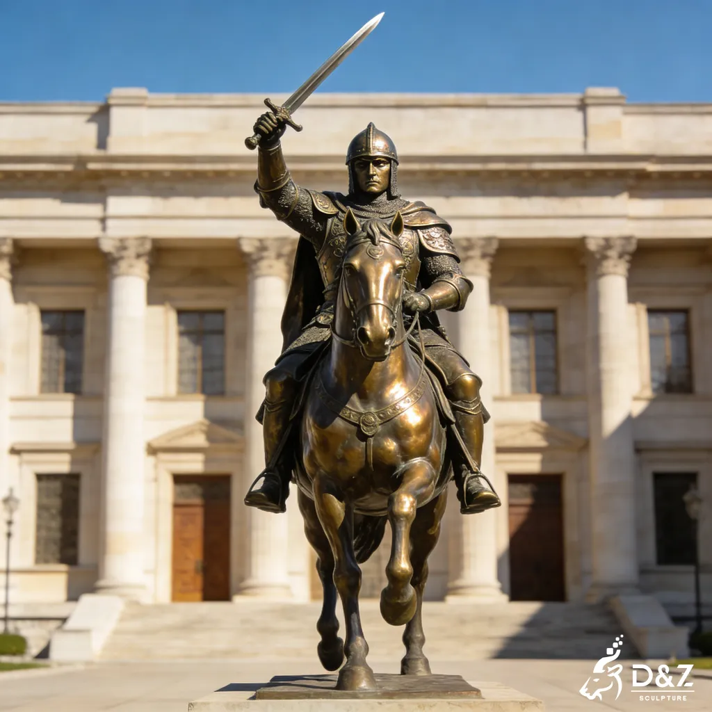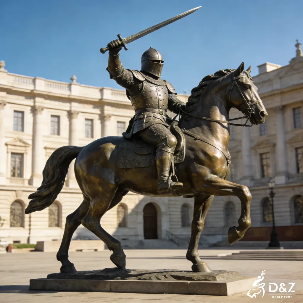 Created by D&Z Art Sculpture, this monumental horse soldier statue captures the heroic spirit of a European medieval knight raising his sword on horseback. Crafted in premium bronze and designed for outdoor display, it is ideal for memorials, city squares, and historical landmarks. Size, finish, and details are fully customizable to meet project needs.