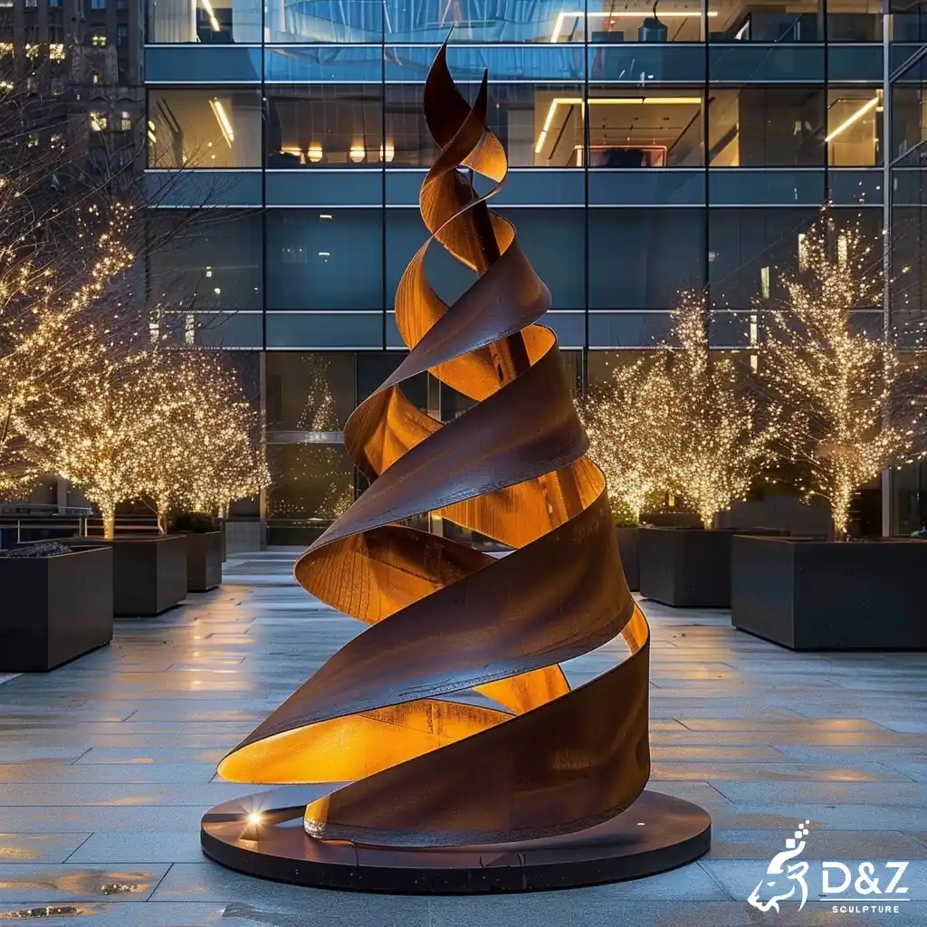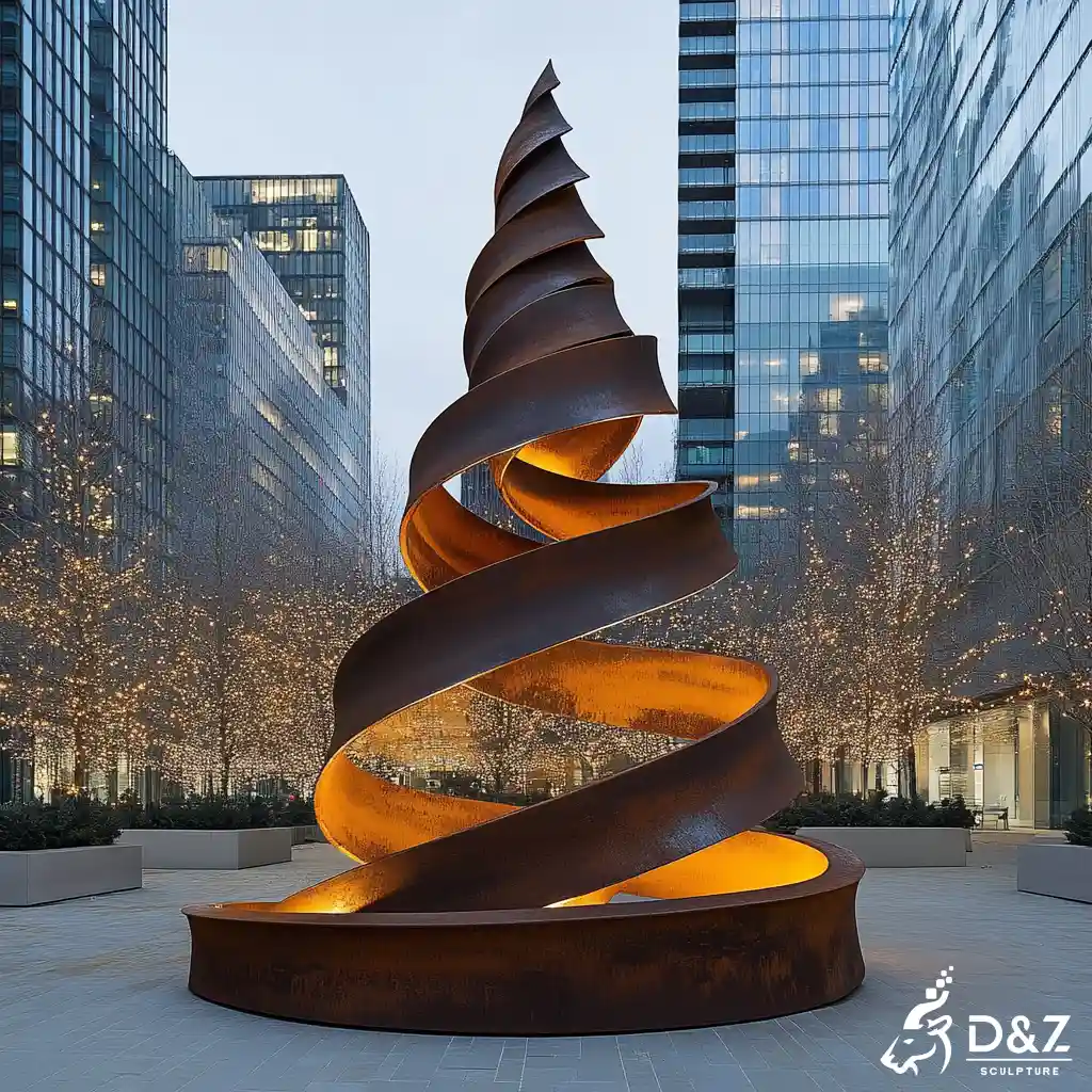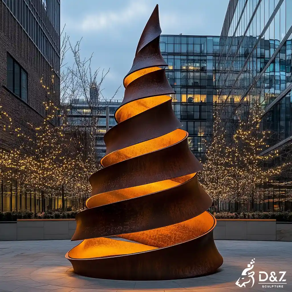 This spiral, LED-lit Christmas tree light sculpture is crafted from corten steel. Ideal for outdoor commercial/residential spaces, it’s customizable. Inquire D&Z Art Sculpture to create your perfect holiday decor.