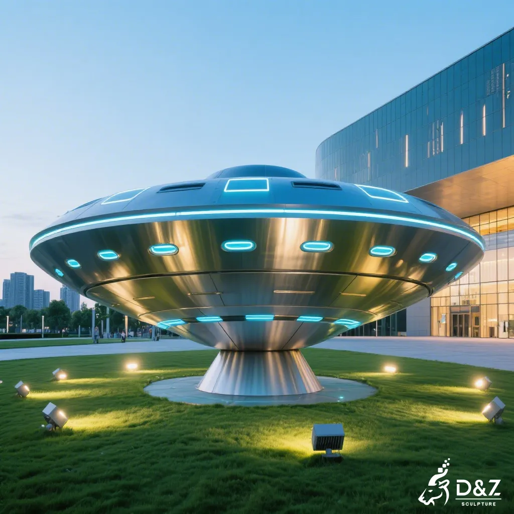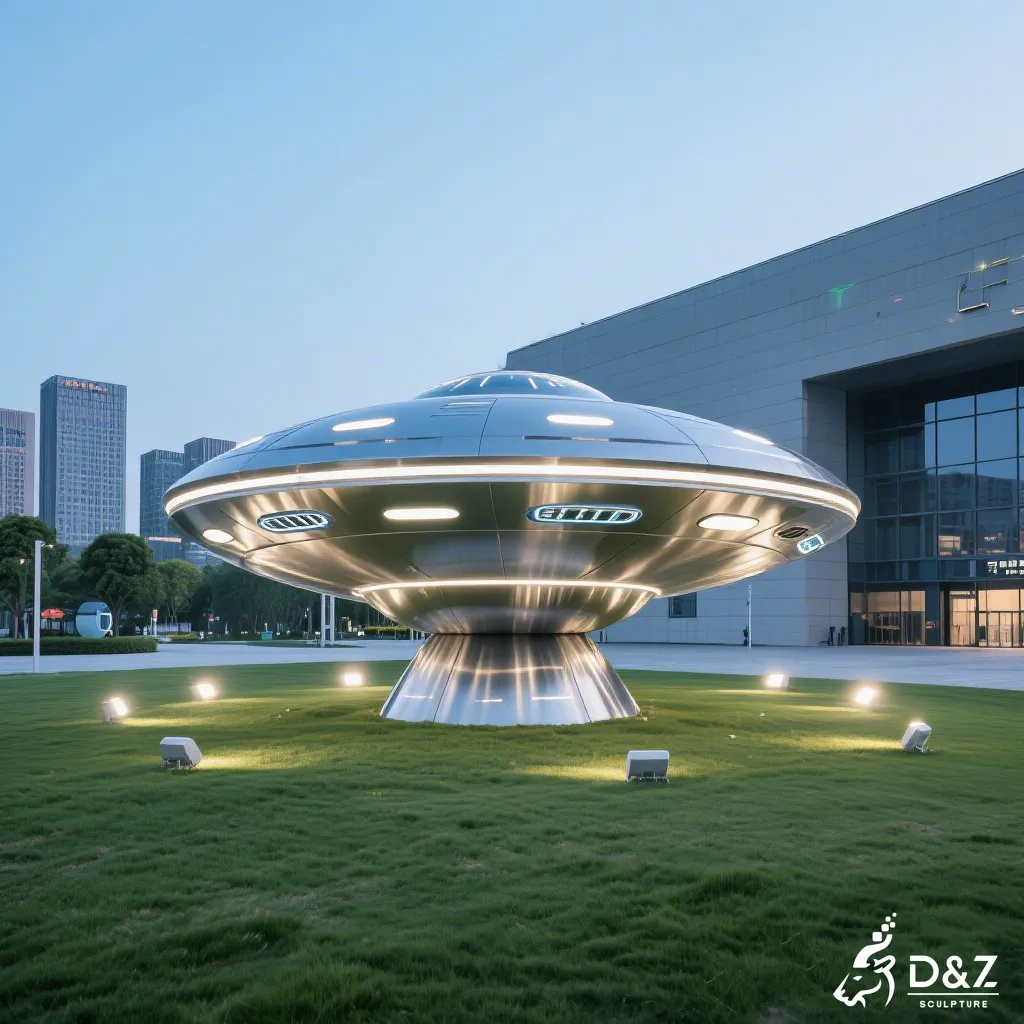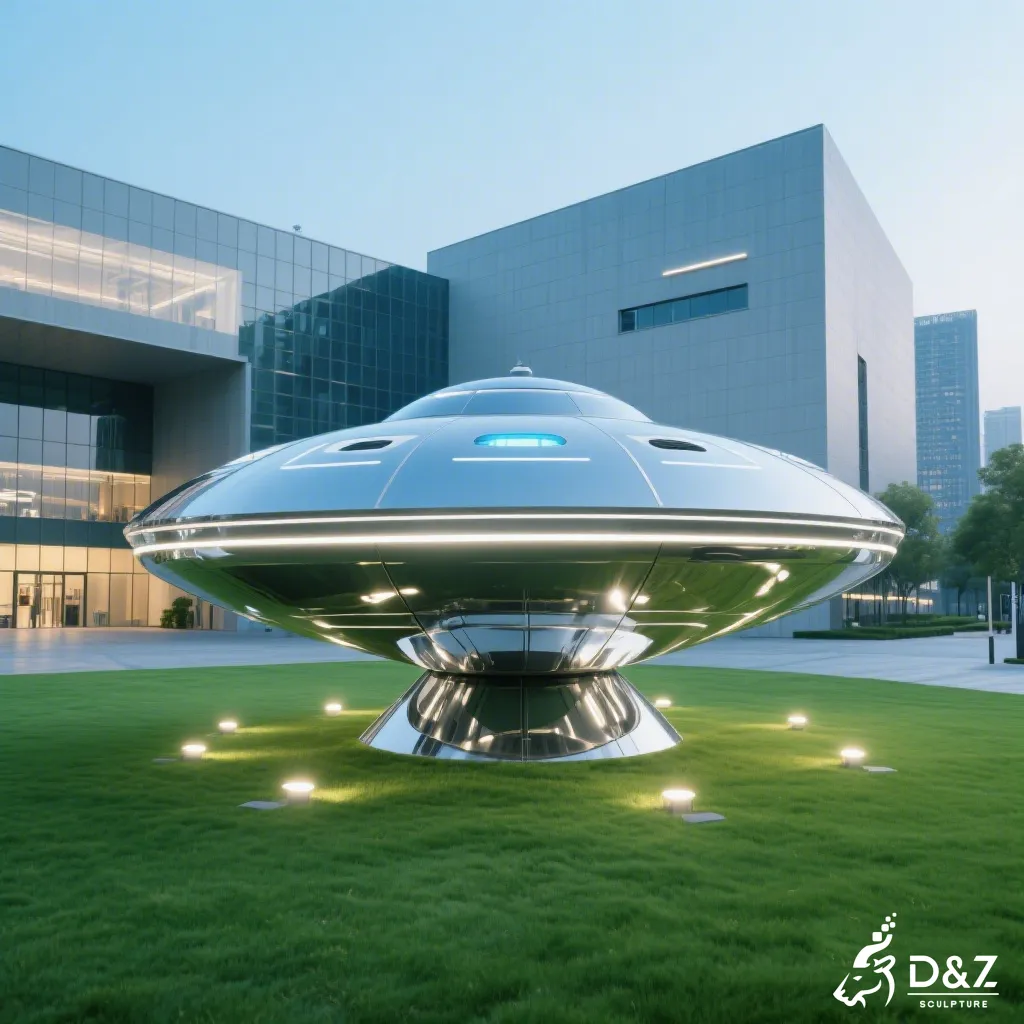 D&Z Art Sculpture presents this stunning giant UFO sculpture, crafted from premium stainless steel with integrated LED lighting. Designed for science museums, tech parks, and urban plazas, this futuristic sculpture offers a high-tech aesthetic, durable mirror-finish materials, and full customization to fit any landscape.