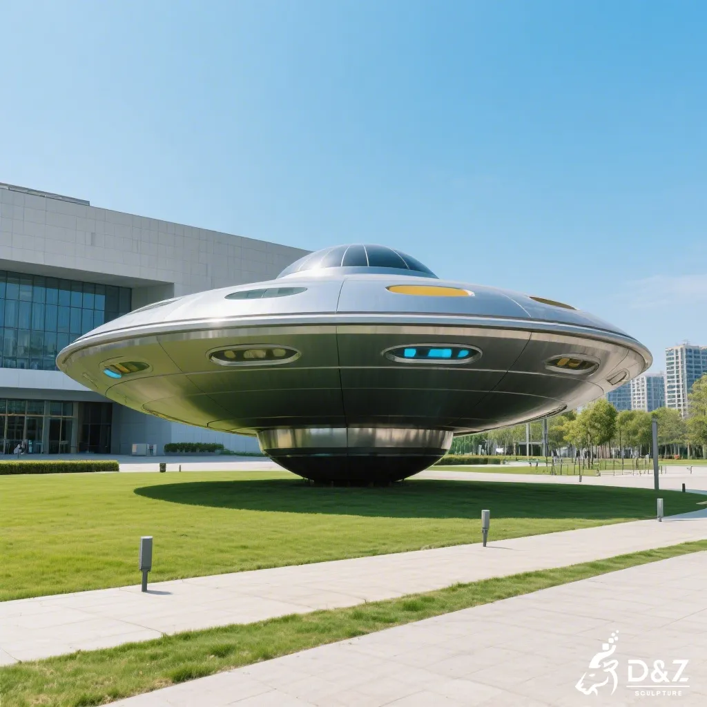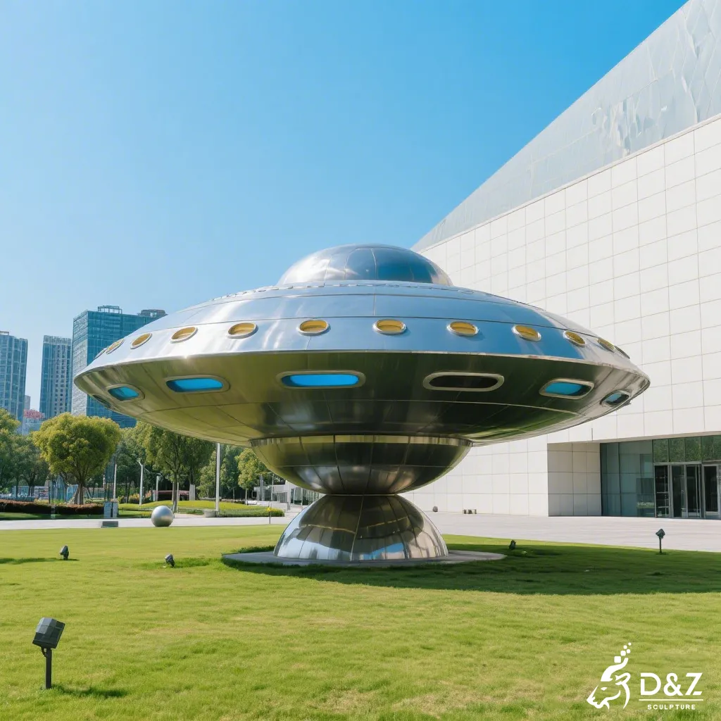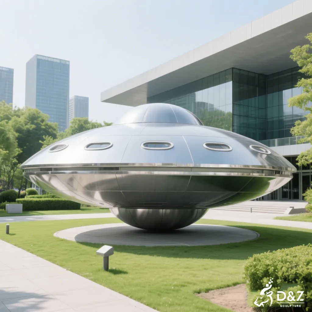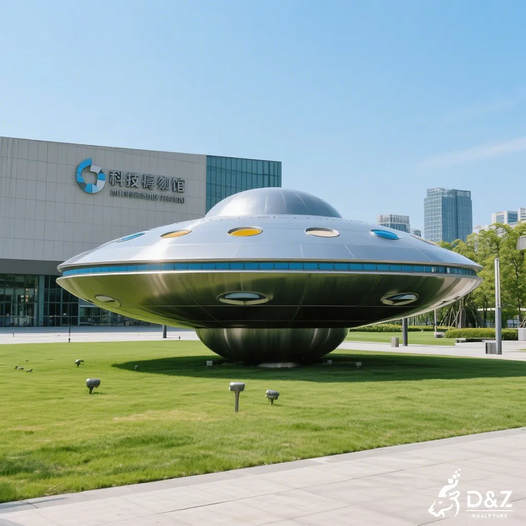 D&Z Art Sculpture presents this stunning giant UFO sculpture, crafted from premium stainless steel with integrated LED lighting. Designed for science museums, tech parks, and urban plazas, this futuristic sculpture offers a high-tech aesthetic, durable mirror-finish materials, and full customization to fit any landscape.