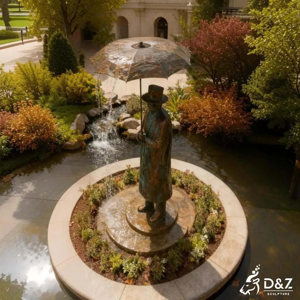 Interactive Water Elements: Water cascades from the umbrella and around the figures, turning the fountain into a lively yet refined centerpiece.