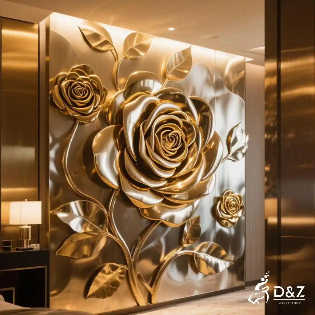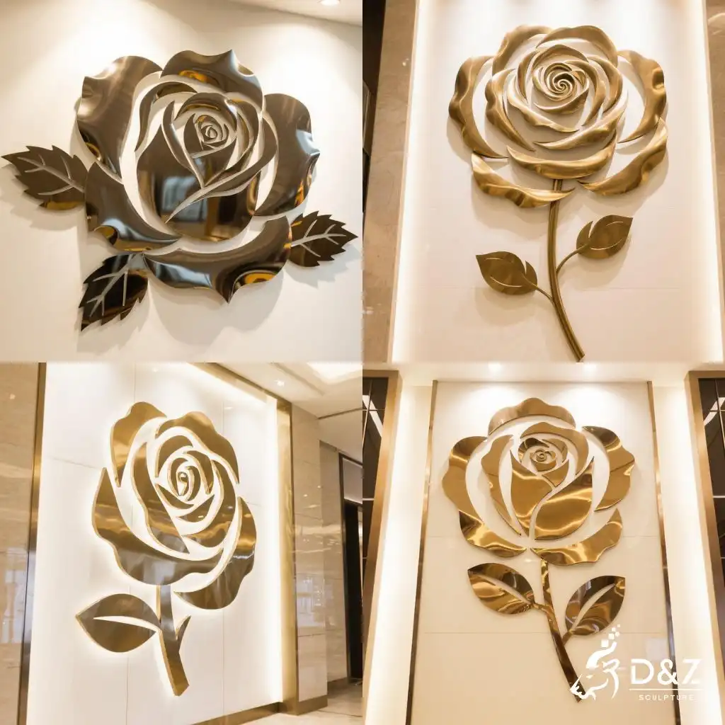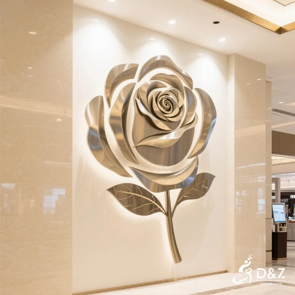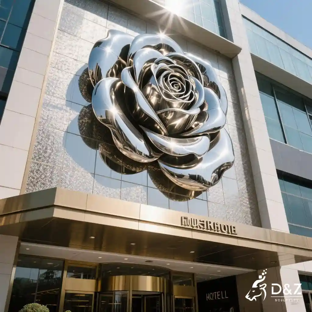 The design symbolizes love, passion, and strength. The reflective stainless steel surface interacts with ambient lighting, producing subtle color shifts throughout the day. Available in rose gold, silver, or custom colors, the rose wall sculpture offers a luxurious focal point that integrates seamlessly with various architectural styles.