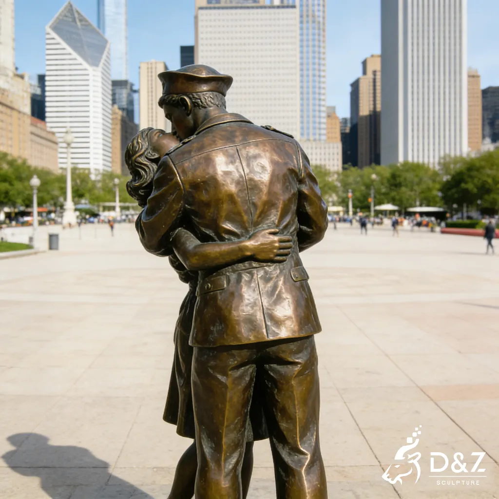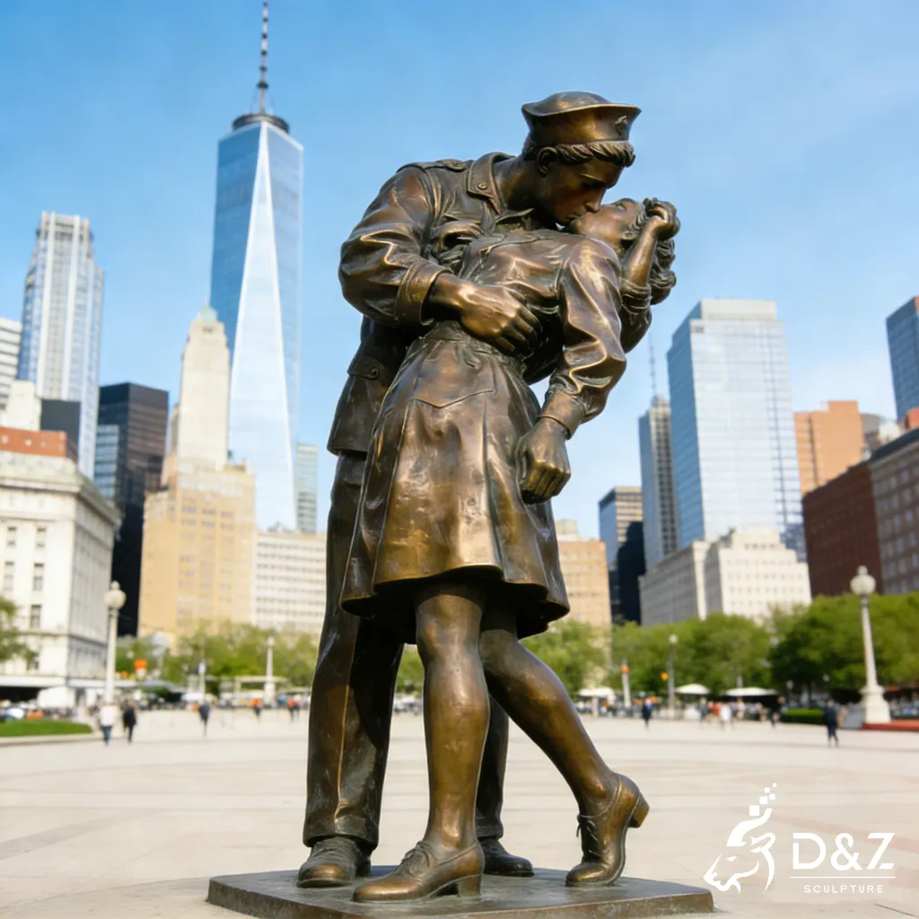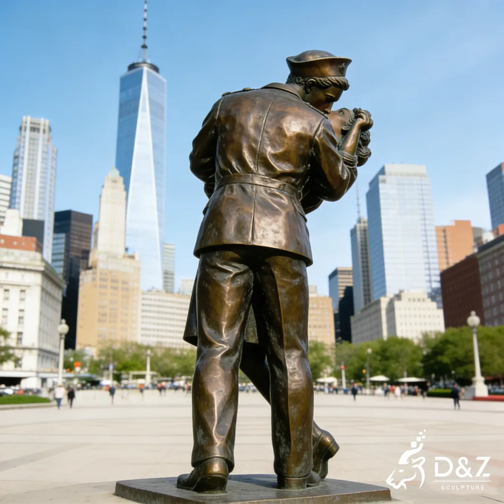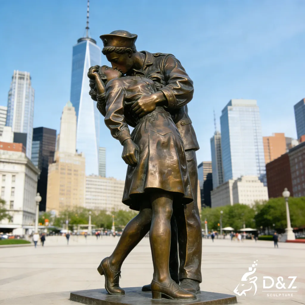 This life-size bronze soldier kissing nurse statue by D&Z Art Sculpture recreates one of the most recognizable and emotionally powerful moments of World War II. Crafted in solid bronze and designed for outdoor display, the sculpture symbolizes victory, love, peace, and reunion. It is ideal for memorial parks, public squares, museums, and landmark projects, with full customization available in size, finish, and base design.
