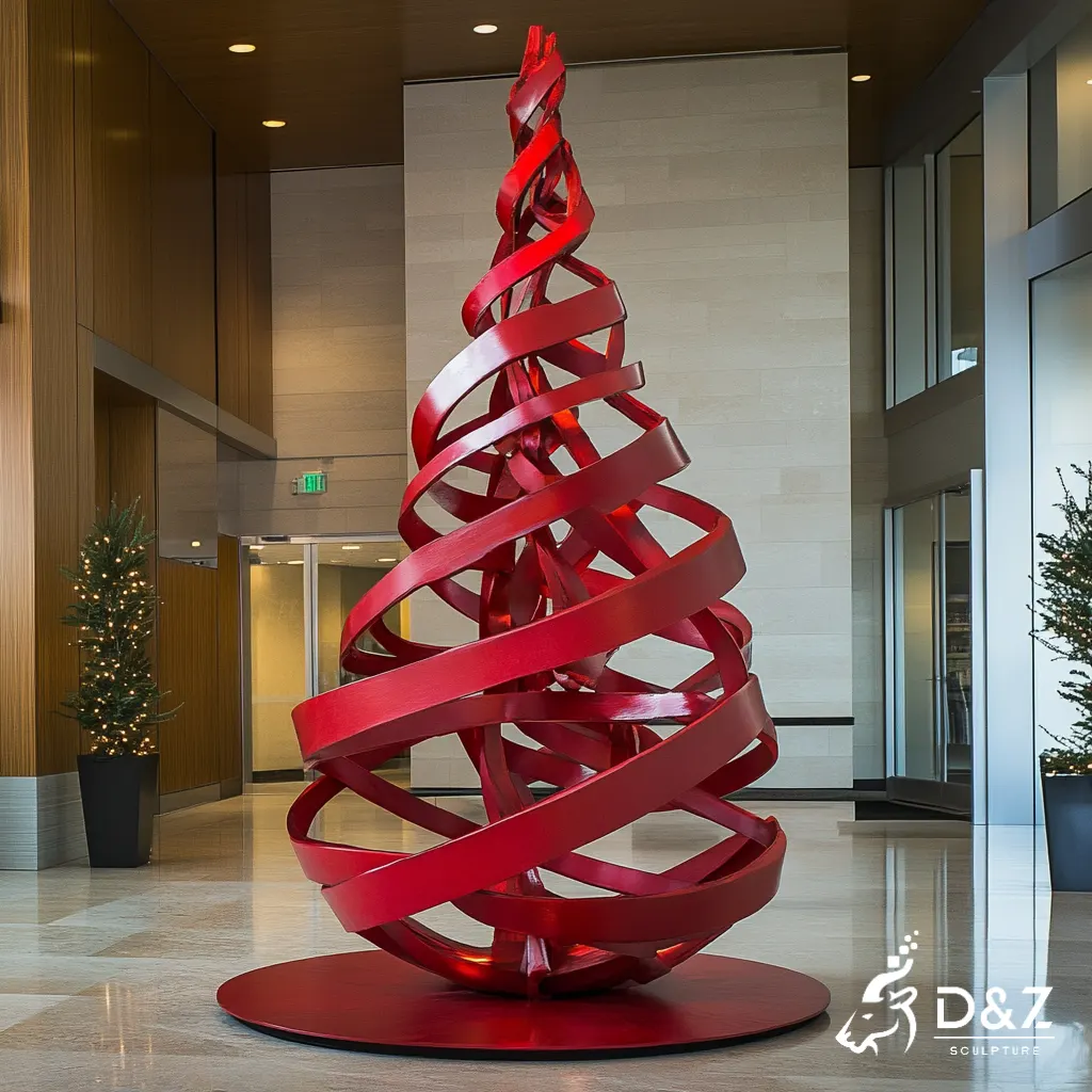 This work is a striking abstract Christmas tree sculpture crafted from metal, shaped as red ribbons. It elevates indoor/outdoor spaces (lobbies, plazas) with modern, artistic holiday charm.