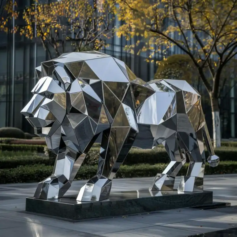 Crafted from marine-grade 304 or 316 stainless steel, this stainless steel geometric abstract lion sculpture ensures long-lasting outdoor performance. The mirror-polished finish highlights each edge, elevating the lion’s stature. It resists corrosion, fading, and weathering, making it ideal for long-term display in gardens, courtyards, and high-traffic public areas.