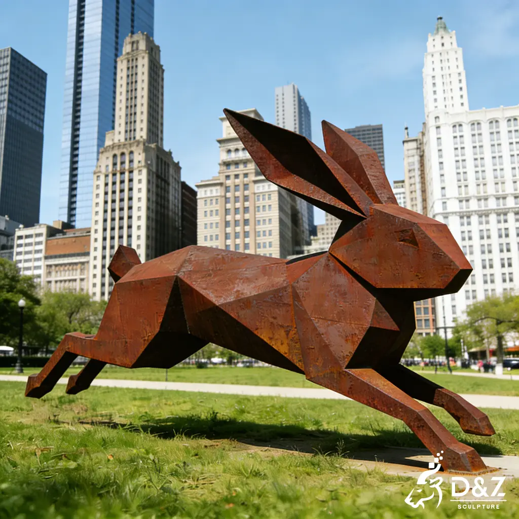 This abstract rabbit sculpture is a large-scale, geometric artwork crafted from premium Corten steel, designed to serve as a visual landmark in gardens, parks, and public spaces. Its bold, angular form, natural rust finish, and symbolic meaning make it an ideal choice for modern outdoor art projects.