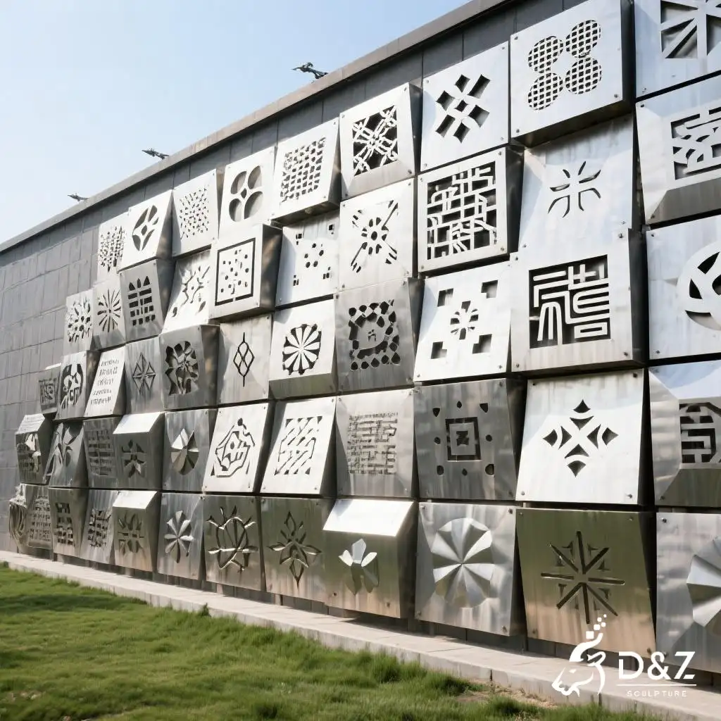 This brick wall sculpture seamlessly combines art, culture, and modern design in a single striking installation. The sculpture is made from premium stainless steel panels shaped like three-dimensional bricks, each engraved with characters, patterns, or abstract symbols. Its polished metallic surface reflects light beautifully, adding both depth and sophistication to architectural facades.