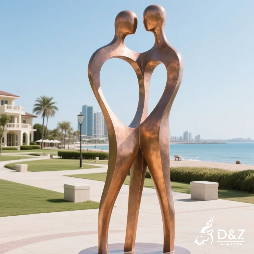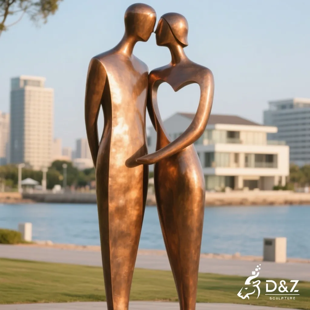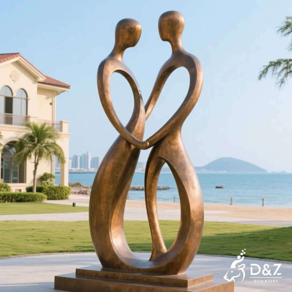 This abstract love sculpture features two slender figures gently facing each other, their forms intertwining in a harmonious rhythm. The fluid curves represent emotional balance and shared passion. The open spaces within the figures create a light and airy feeling, giving the artwork a poetic sense of movement. The couple in love sculpture features flowing lines and organic shapes, capturing the intimate moment of two souls united. Every curve and contour reflects the artistry of D&Z Art Sculpture, making it one of the most captivating sculptures about love you’ll find.