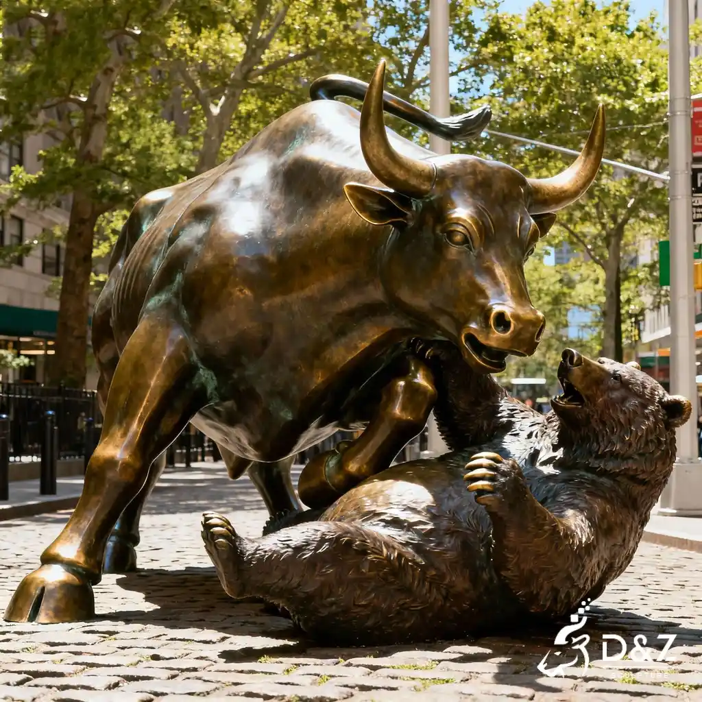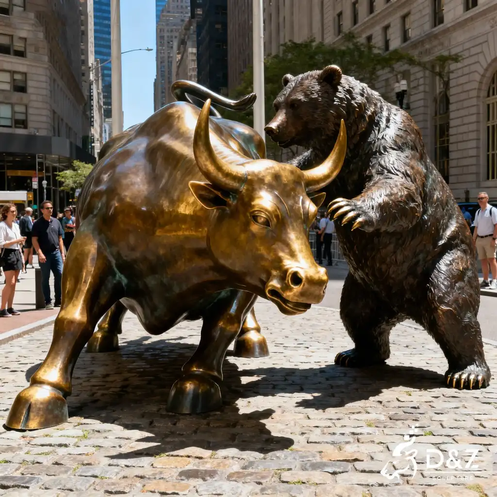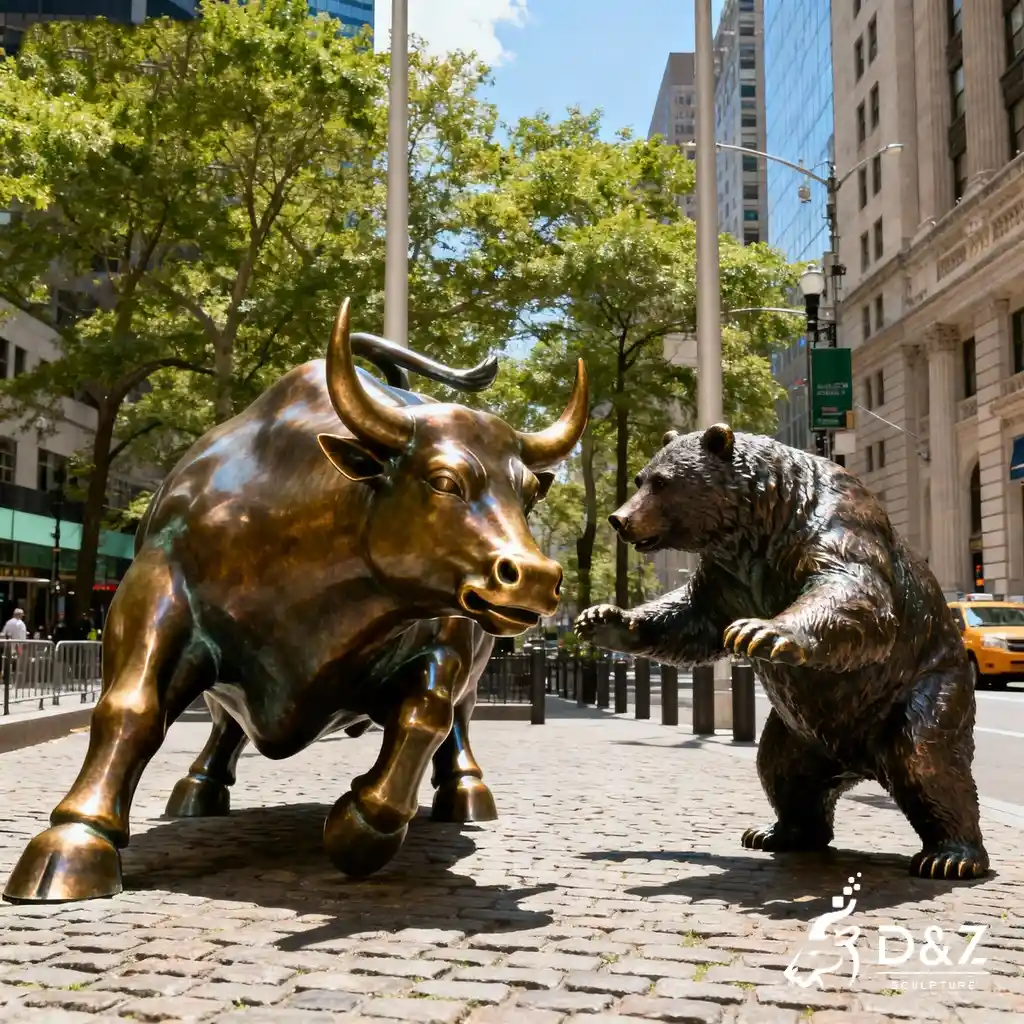 The bull and bear statue on Wall Street represents two opposing market forces: the aggressive upward drive of the bull and the cautious defensive stance of the bear. D&Z Art Sculpture brings this dynamic encounter to life through lifelike posture, detailed muscle definition, and polished bronze surfaces that gleam with vitality under sunlight. The pair confronts each other on a cobblestone-style base, creating a visual dialogue filled with energy and tension.