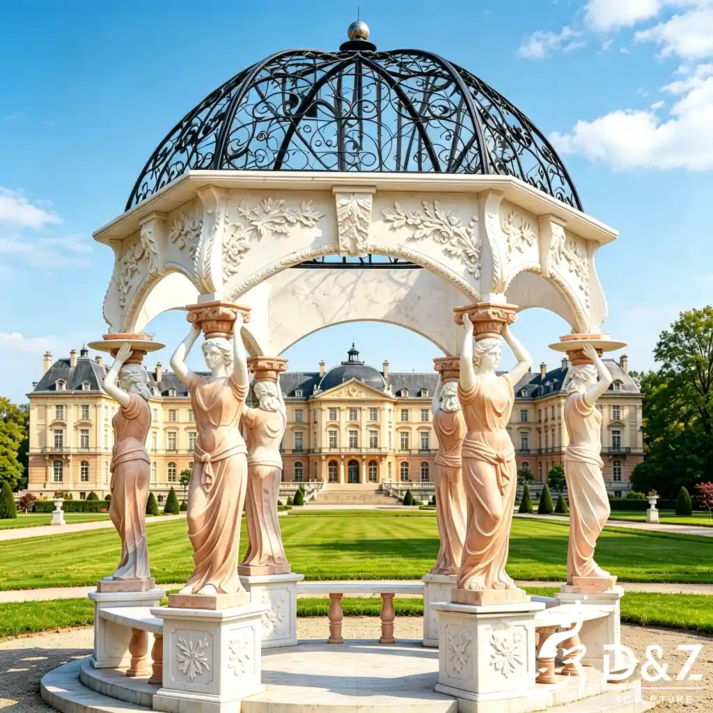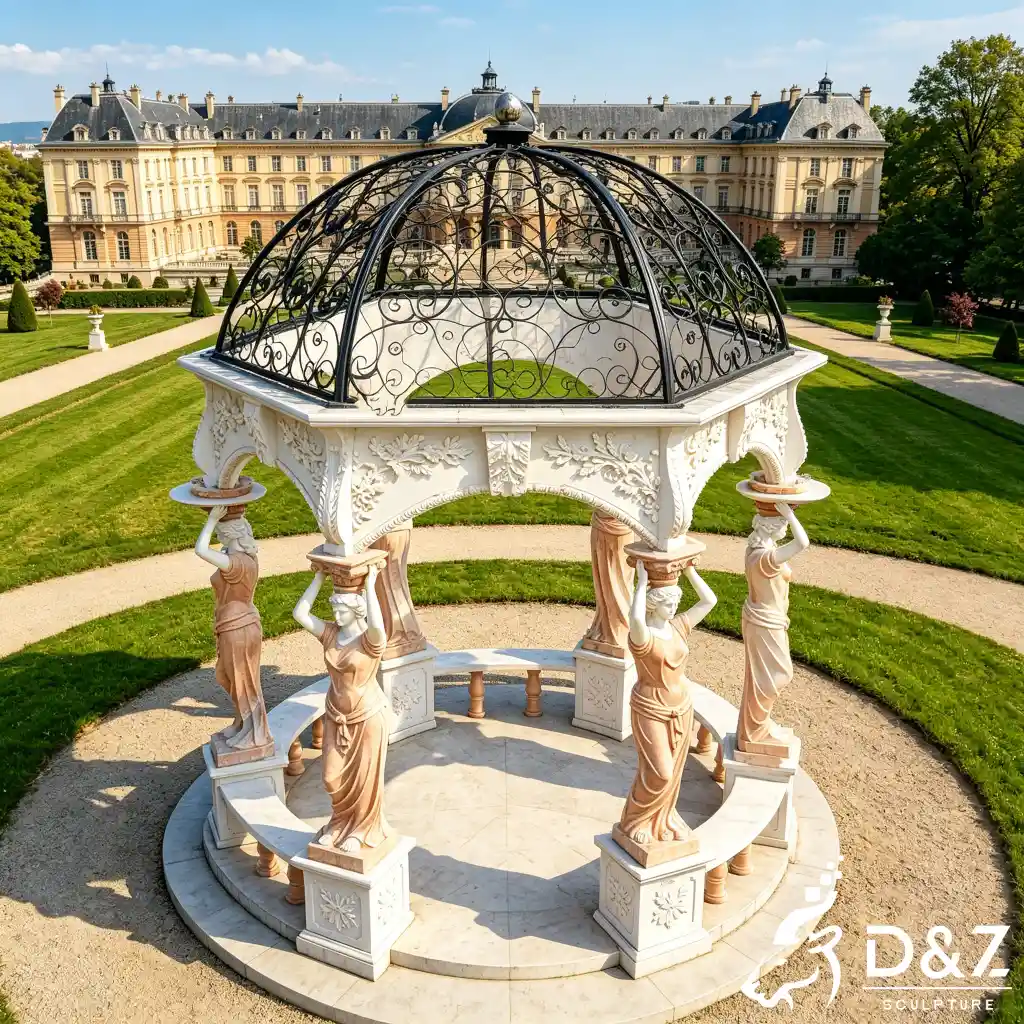 A: This is a 100% natural stone gazebo. We use high-grade Carrara white marble and natural red marble for the statues, ensuring superior texture and weather resistance. - Q: How does the wrought iron dome gazebo handle weather?