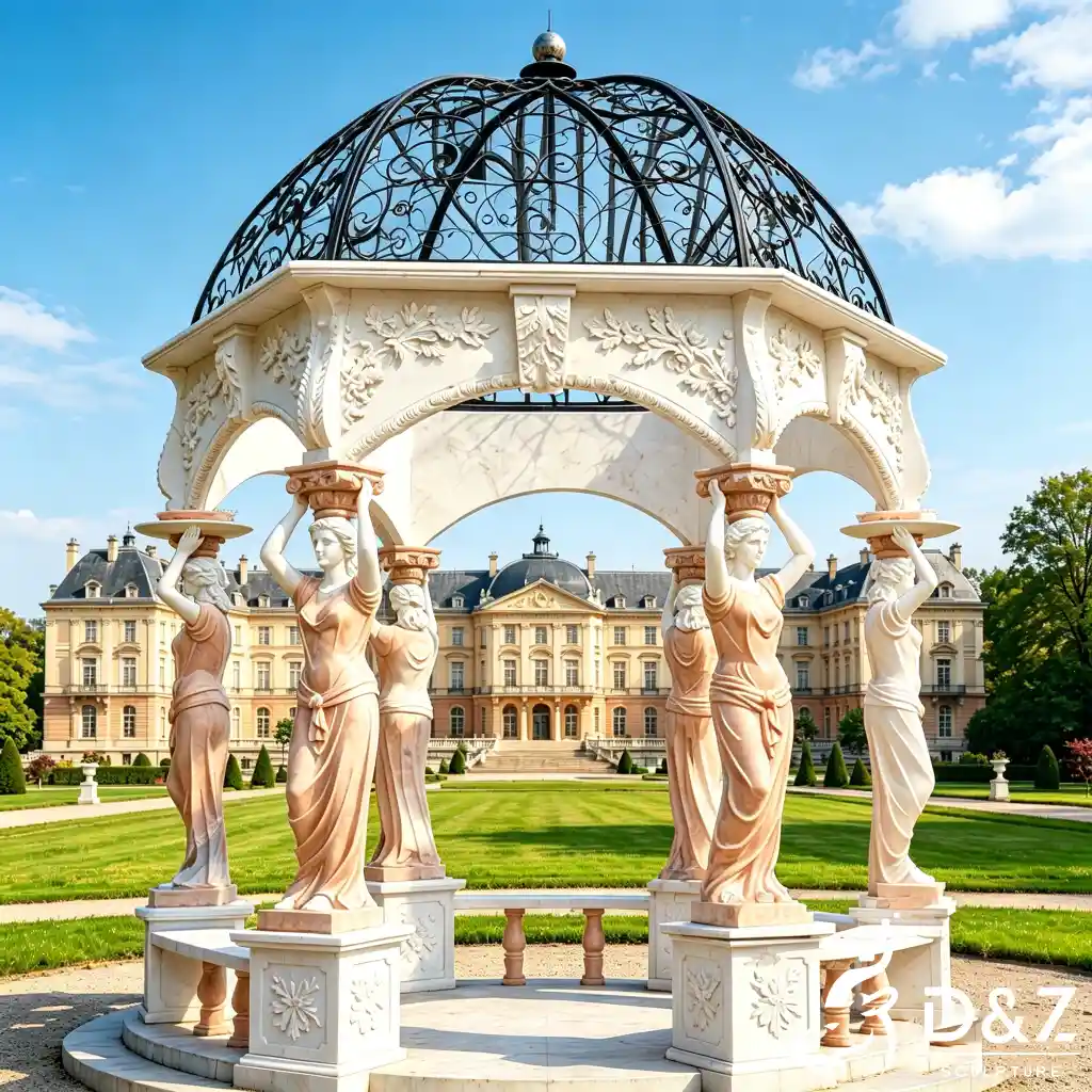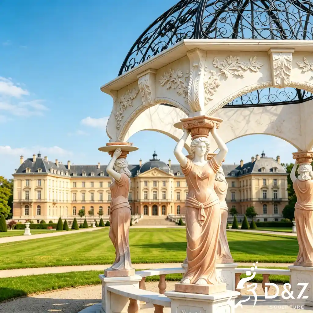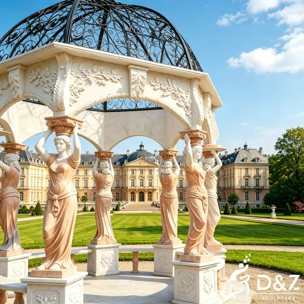 A: The design draws directly from Caryatid Greek architecture, specifically the Porch of the Maidens on the Acropolis. We have revived this classical art form to create a gazebo with stone columns that serves both as architecture and sculpture. - Q: Is this a marble gazebo or made of artificial stone?