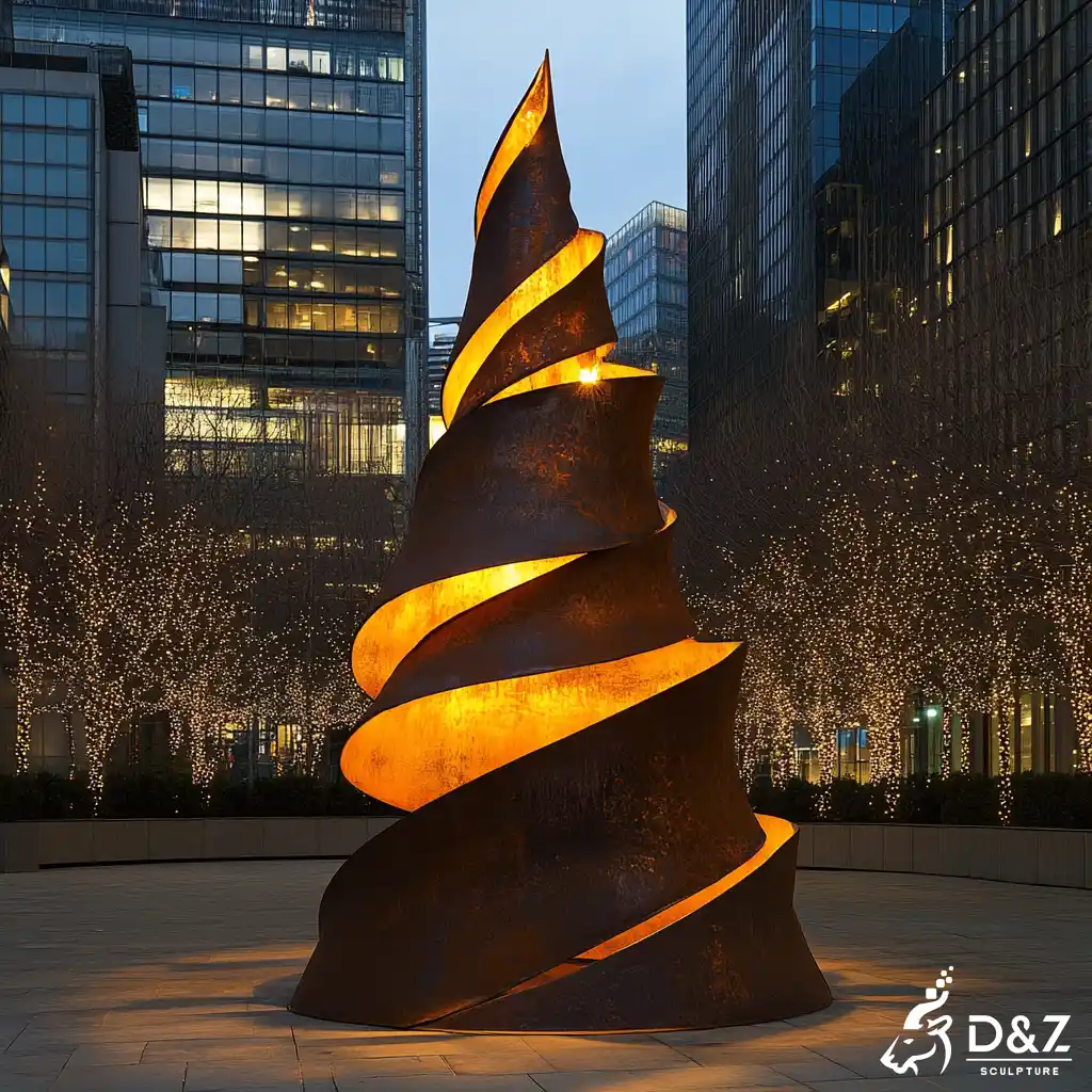 This spiral, LED-lit Christmas tree light sculpture is crafted from corten steel. Ideal for outdoor commercial/residential spaces, it’s customizable. Inquire D&Z Art Sculpture to create your perfect holiday decor.