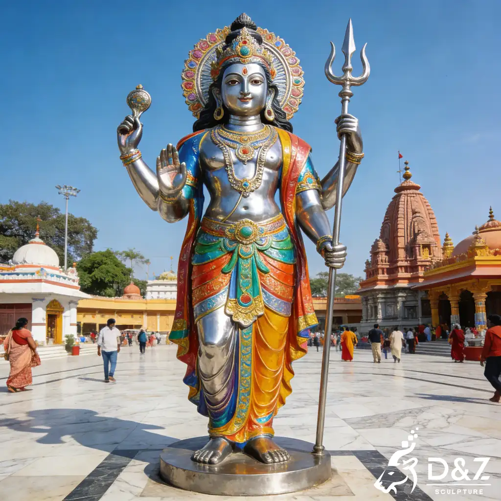 The statue features balanced proportions, detailed jewelry, and a majestic crown. The sacred trident and symbolic elements emphasize Vishnu’s divine authority. Meanwhile, the colorful metal surface gives the artwork a fresh identity as a modern indian sculpture suitable for both traditional and contemporary environments.