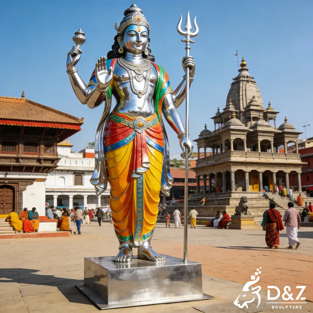 This large modern outdoor sculpture represents Lord Vishnu with a graceful posture and refined ornament details. The reflective surface enhances the divine presence while bringing a bold modern sculpture design to traditional religious art. For temples, architects, and collectors seeking meaningful sacred art, this sculpture offers both spiritual value and modern aesthetics.