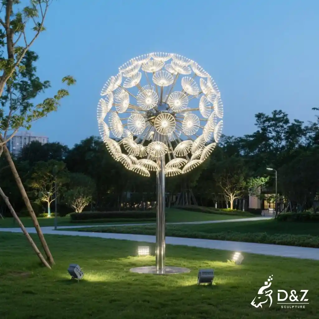 The dandelion art sculpture is a modern stainless steel landmark that blends natural inspiration with contemporary design. Its graceful form captures the lightness of dandelion seeds, bringing beauty and symbolism to both public and private landscapes.