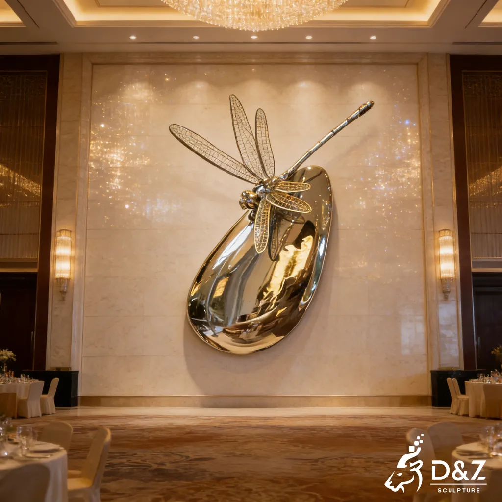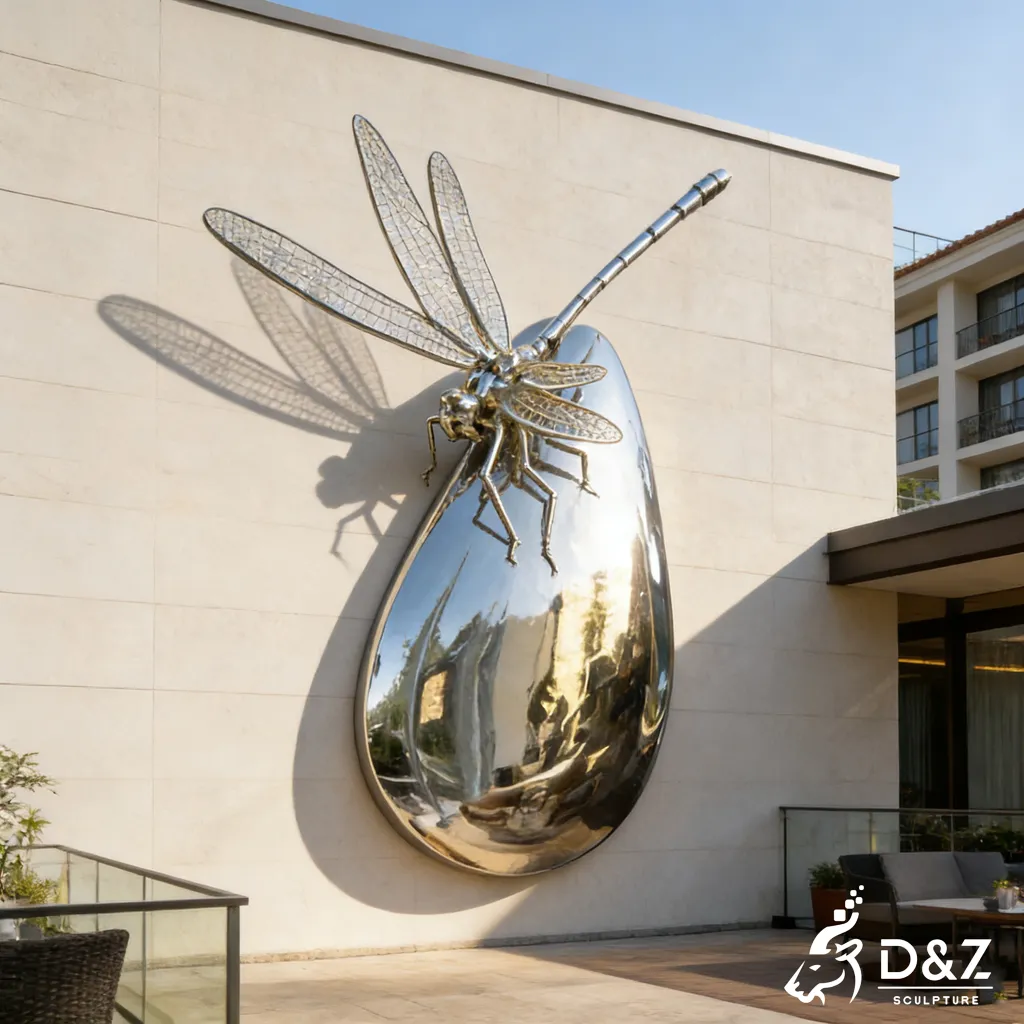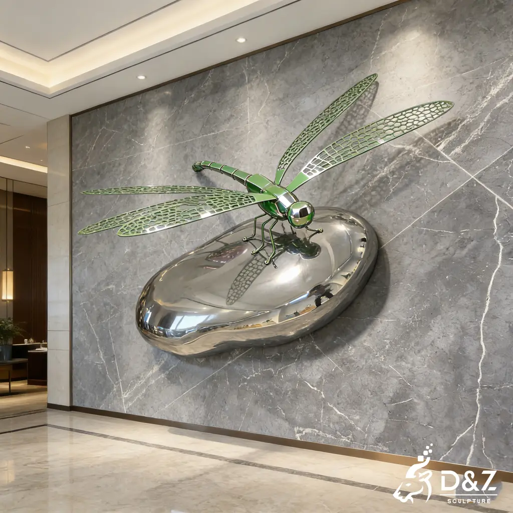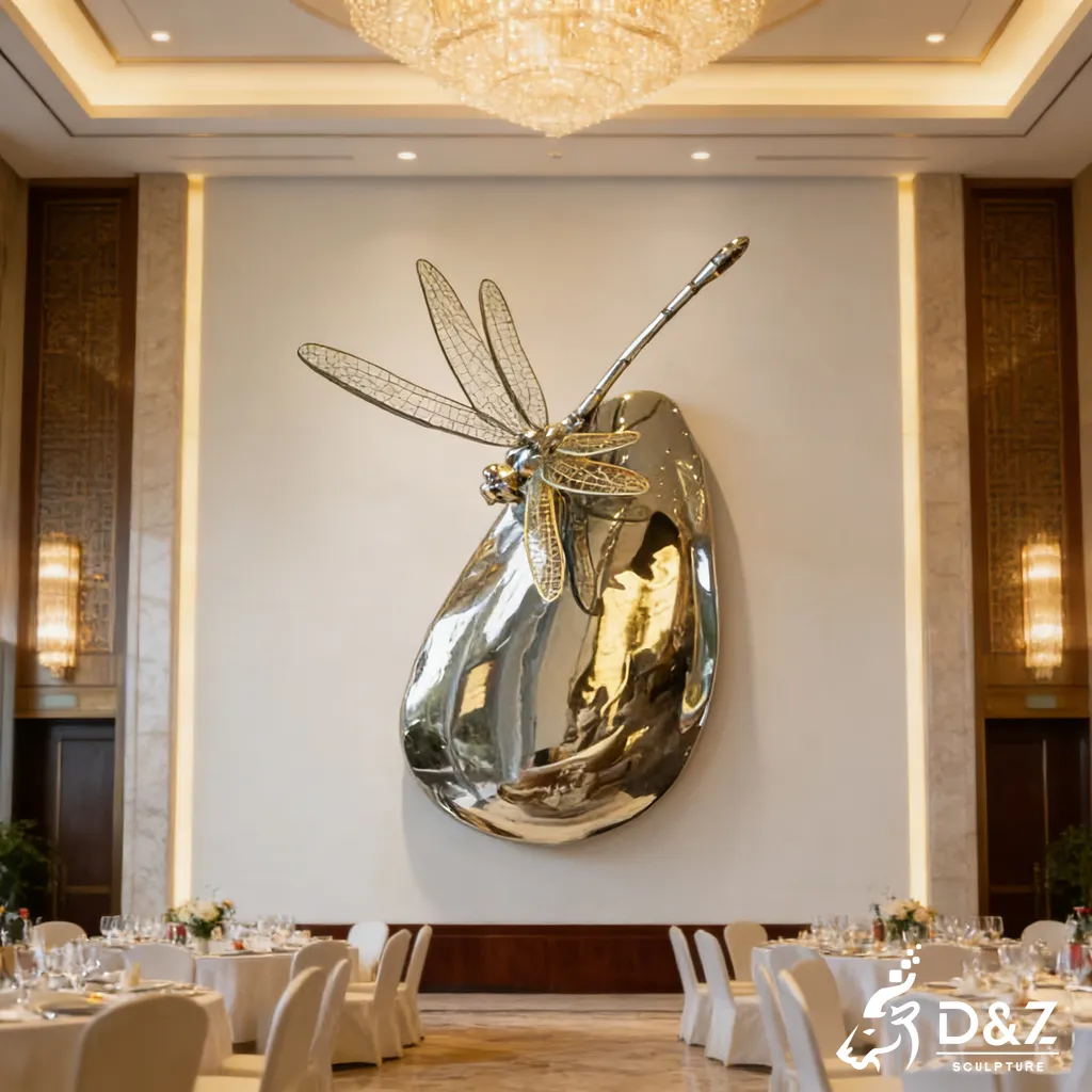 Elevate your architectural vision with the large metal dragonfly wall sculpture on a mirrored pebble base. This exquisite dragonfly sculpture blends organic inspiration with high-end modern art, offering a breathtaking focal point for luxury interiors and commercial spaces. As a premier manufacturer, we provide 100% custom-made solutions for designers and developers worldwide.