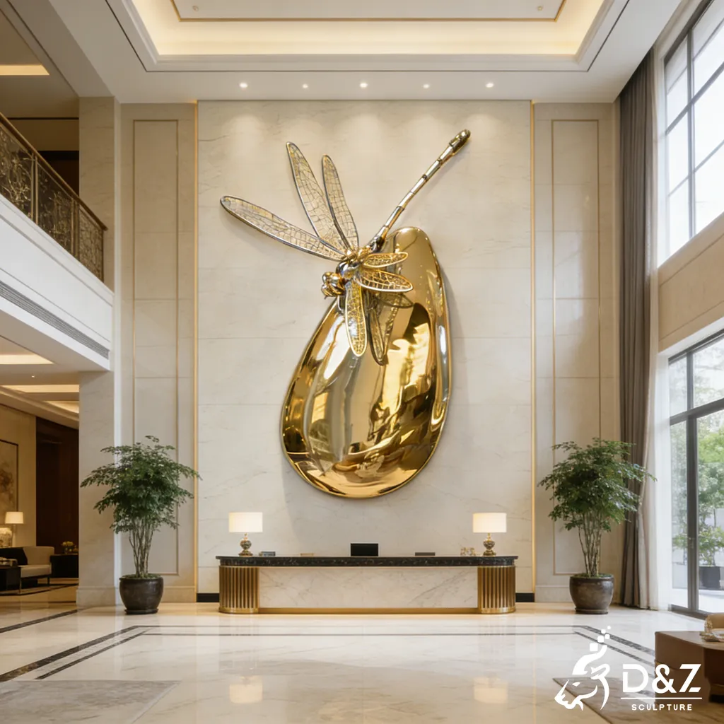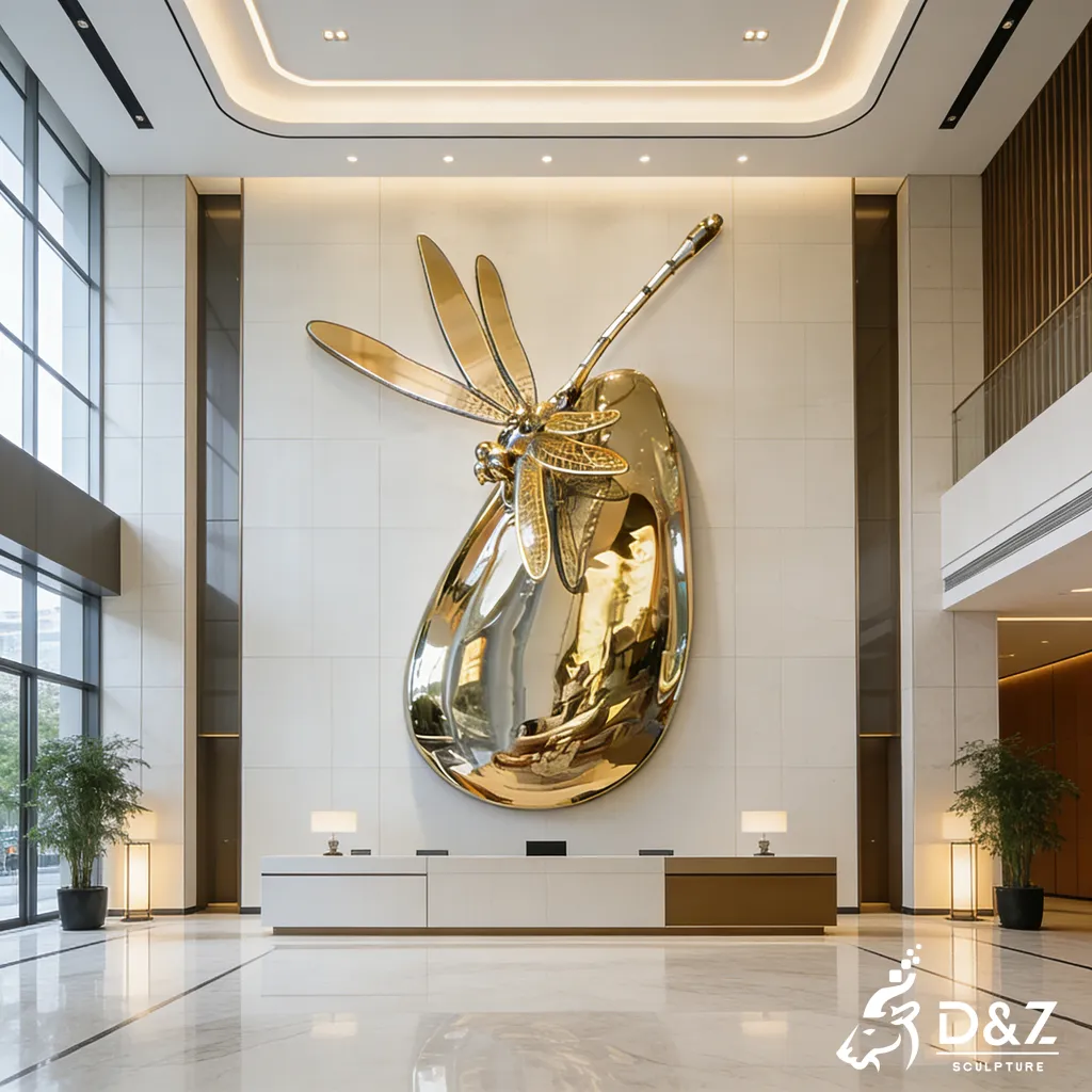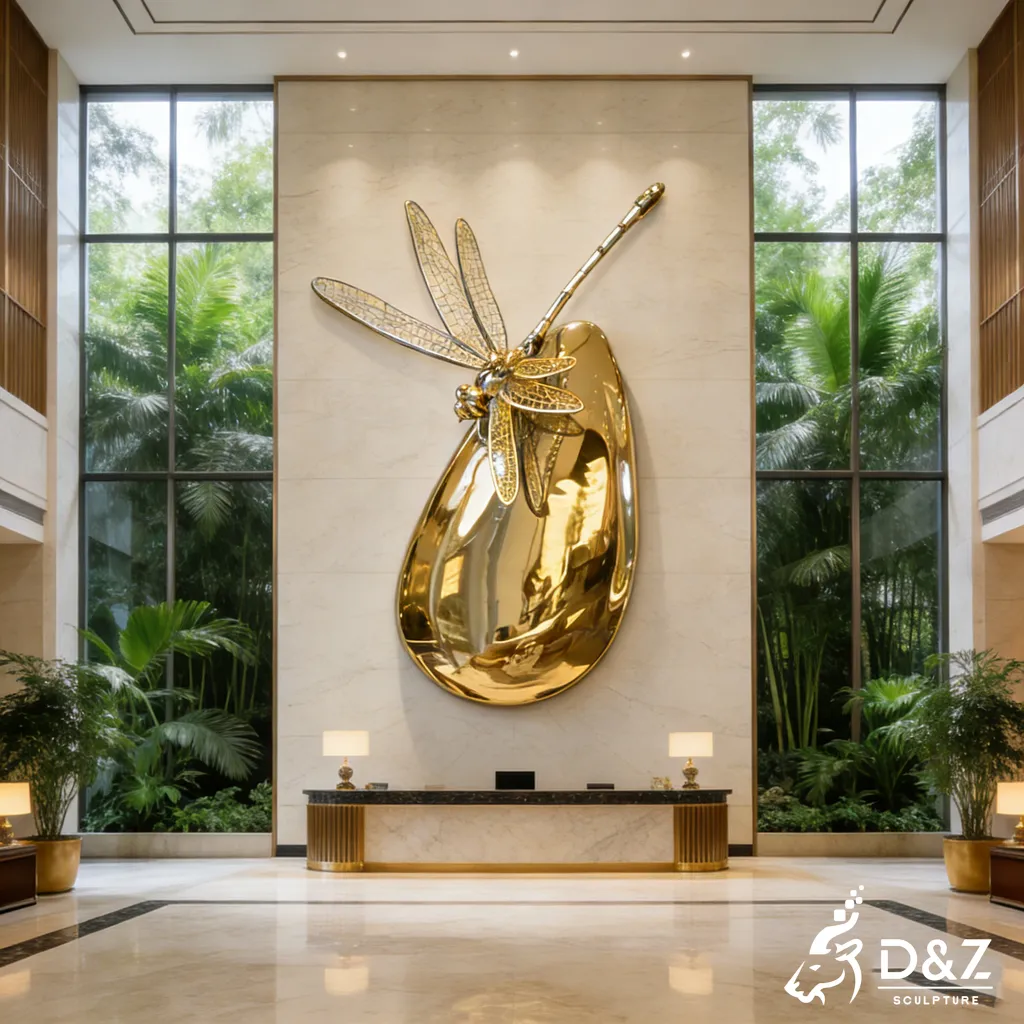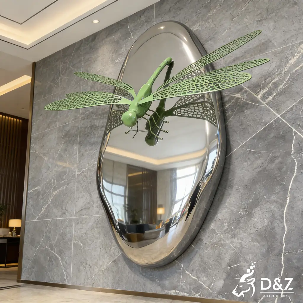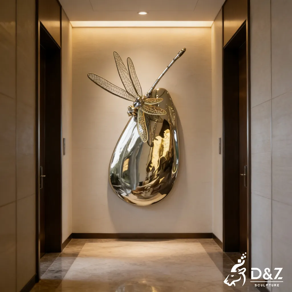 Elevate your architectural vision with the large metal dragonfly wall sculpture on a mirrored pebble base. This exquisite dragonfly sculpture blends organic inspiration with high-end modern art, offering a breathtaking focal point for luxury interiors and commercial spaces. As a premier manufacturer, we provide 100% custom-made solutions for designers and developers worldwide.