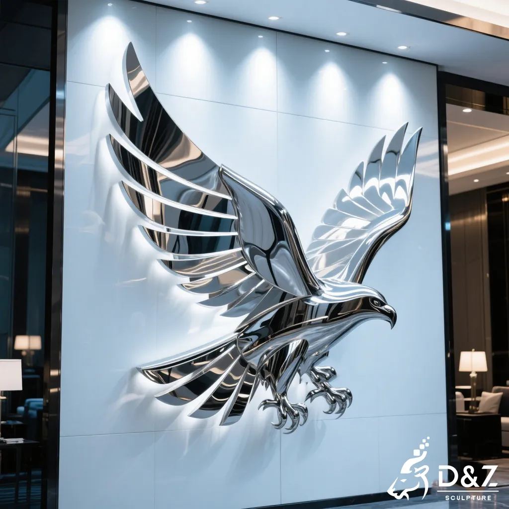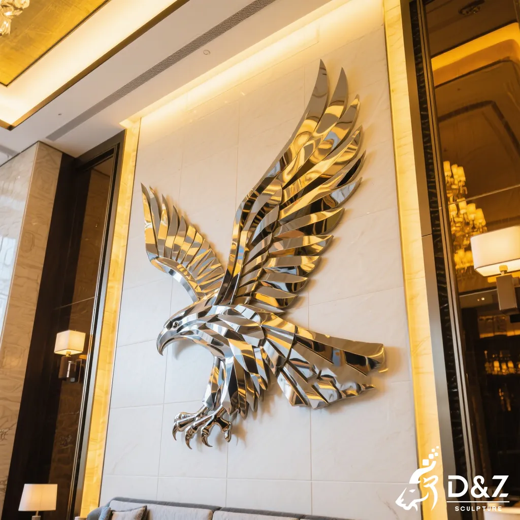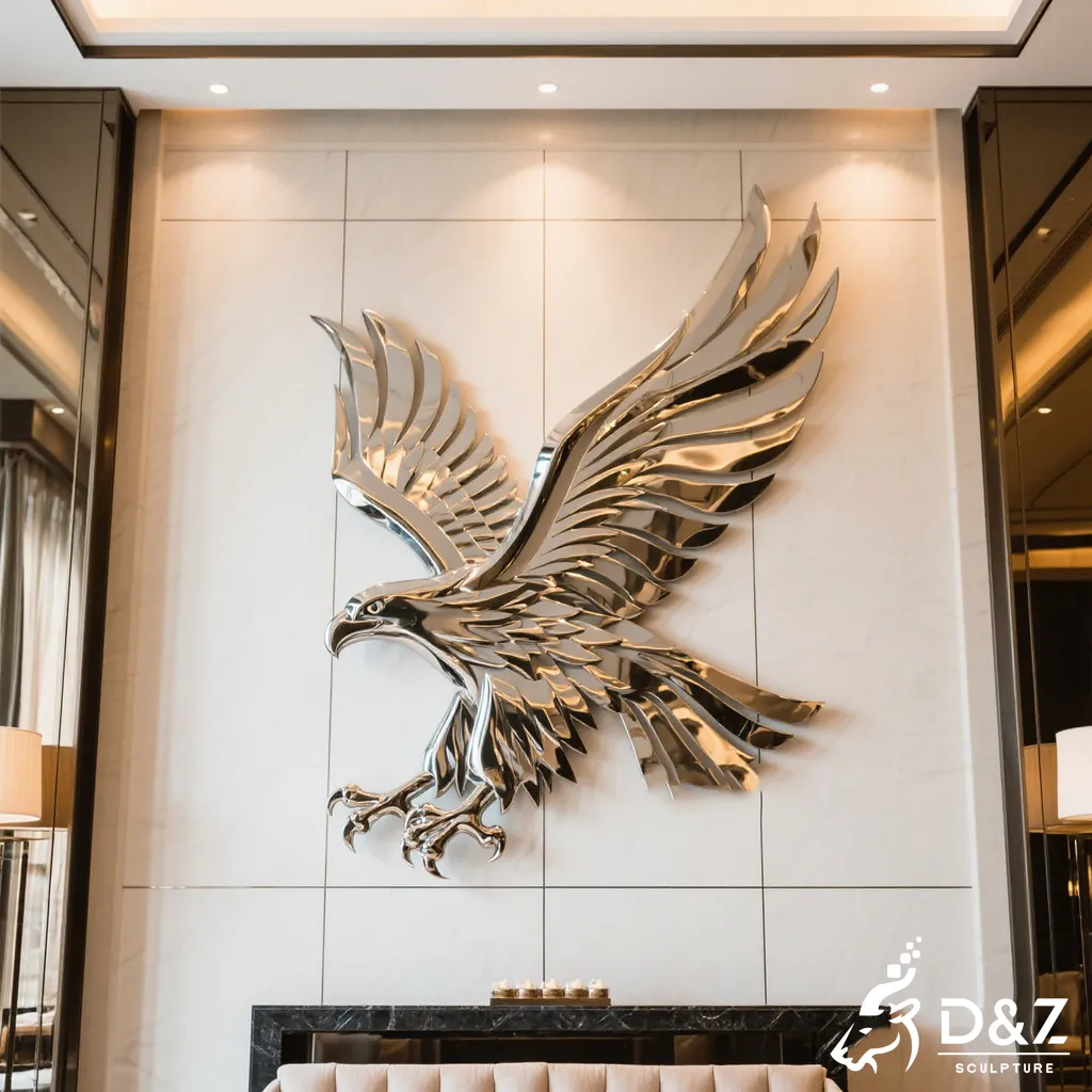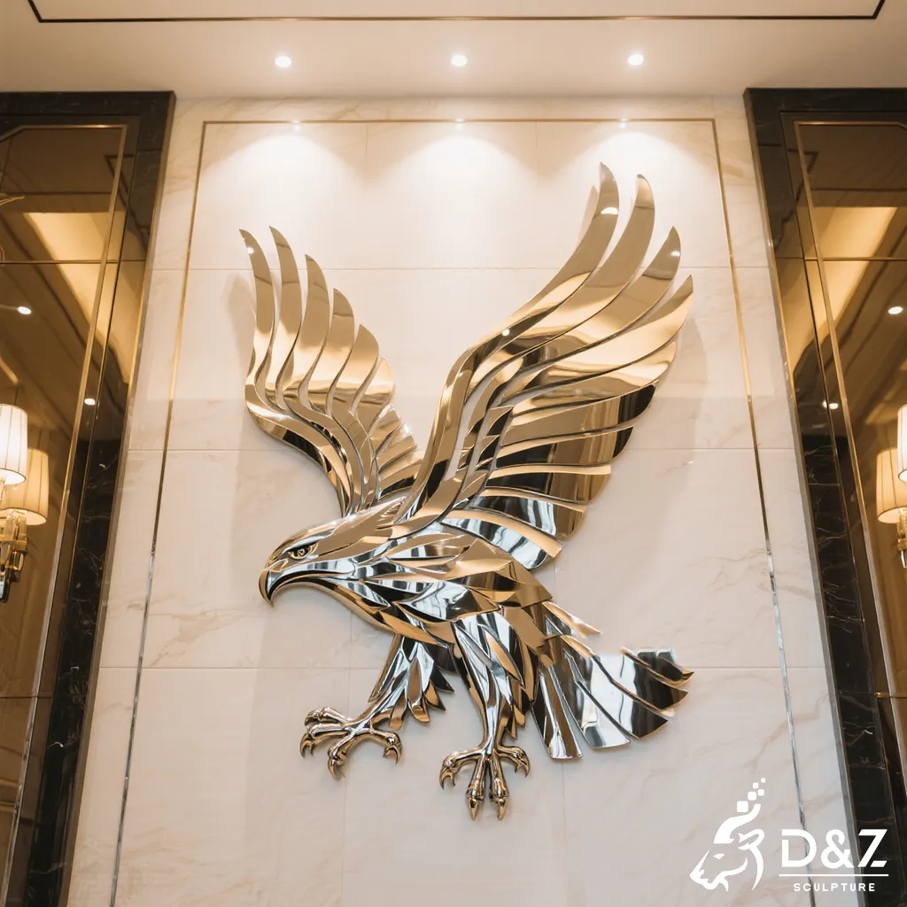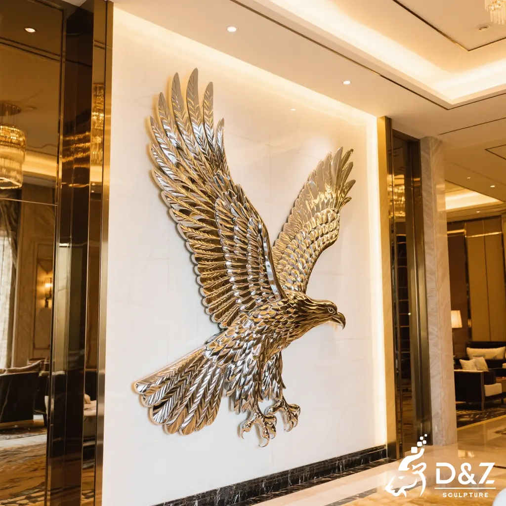 This eagle wall sculpture is a large-scale stainless steel artwork designed for luxury hotels, commercial buildings, and high-end architectural walls. Crafted as a powerful metal eagle sculpture, it combines striking visual impact with long-term durability, making it ideal for both indoor and outdoor applications.