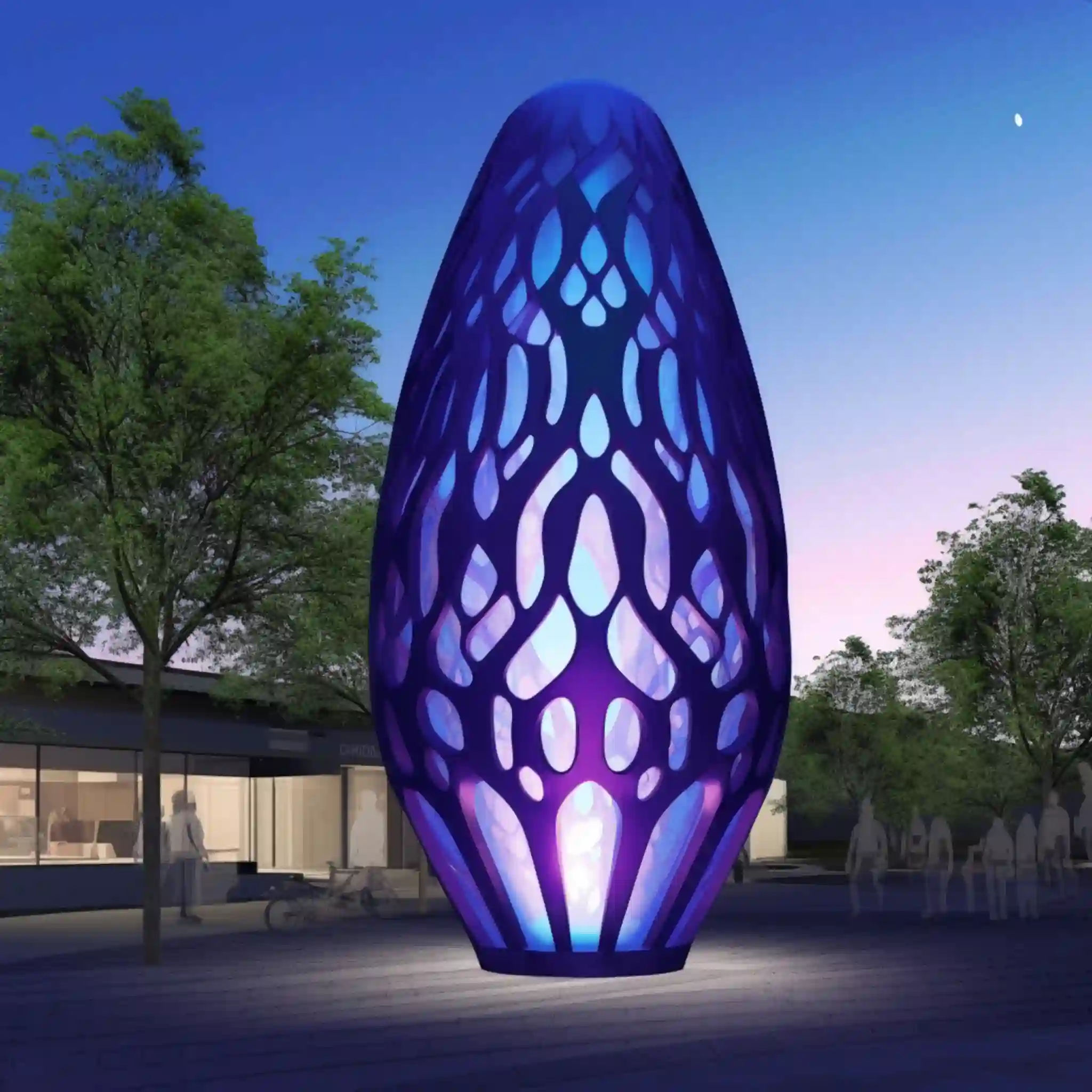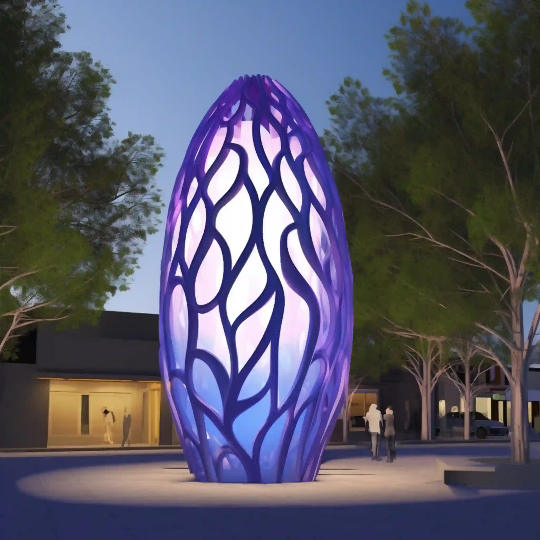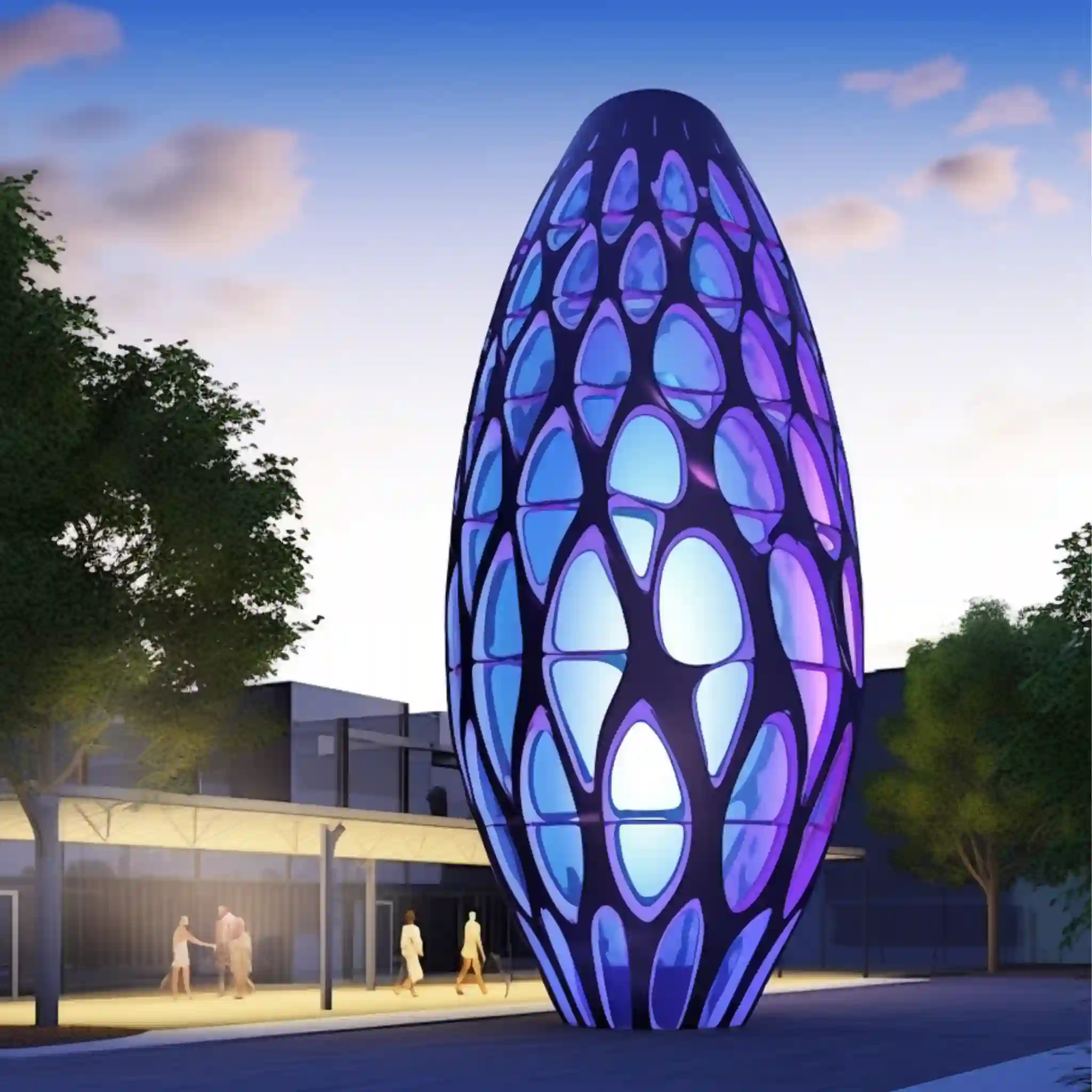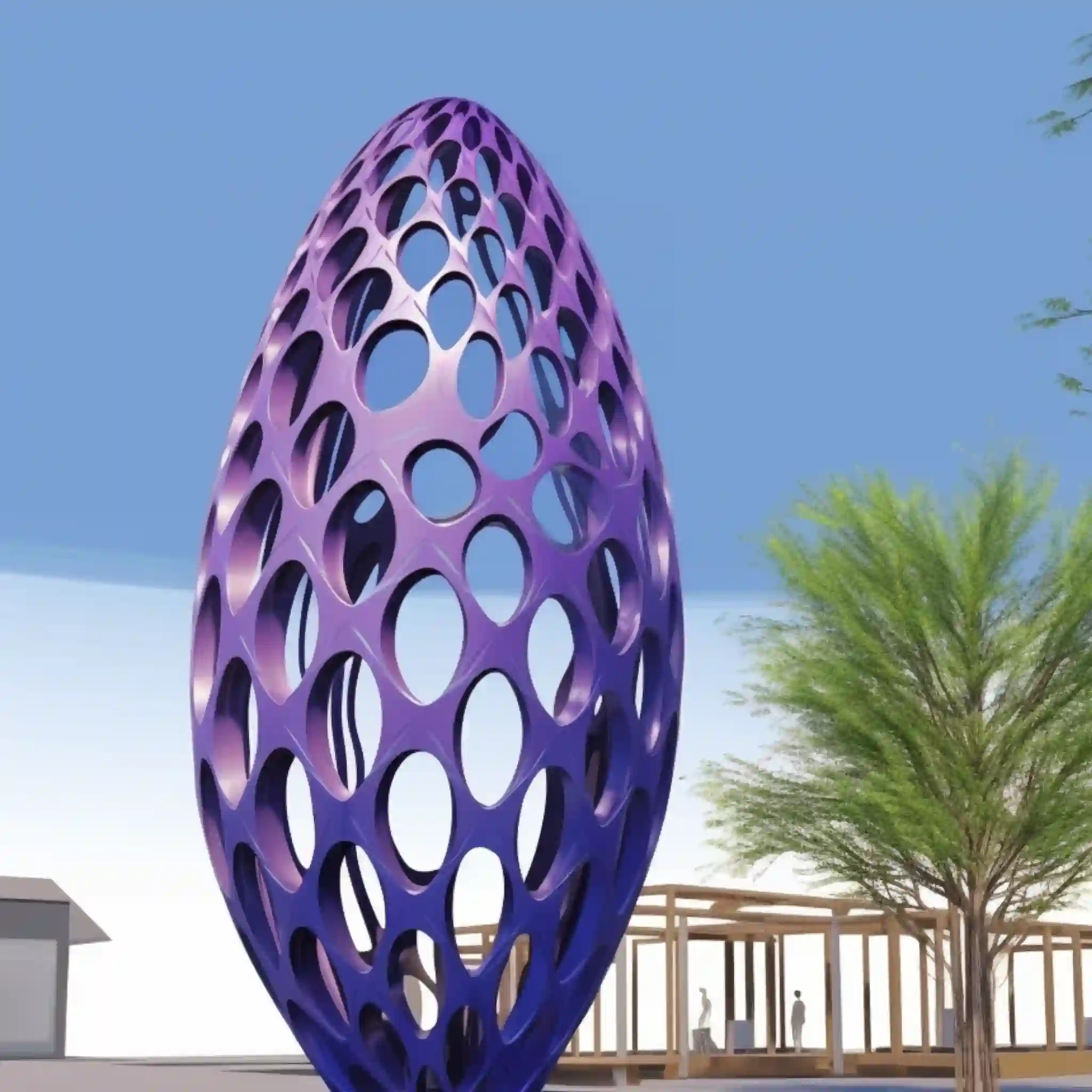 These modern egg sculpture perfectly interprets the parametric design of Zaha Hadid’s style. Its unique vertical shape is like a giant egg, standing above the ground, giving people a futuristic feeling. As a lighting installation, this architectural statue is particularly eye-catching at night with colorful lights. The steel grid pattern on the top not only adds a sense of layering to the sculpture but also highlights Zaha Hadid’s consistent, complex, and dynamic design style. The use of fractal patterns makes the whole sculpture full of artistic sense and visual impact. No matter from which angle you look at it, this architectural sculpture shows different beautiful scenes.