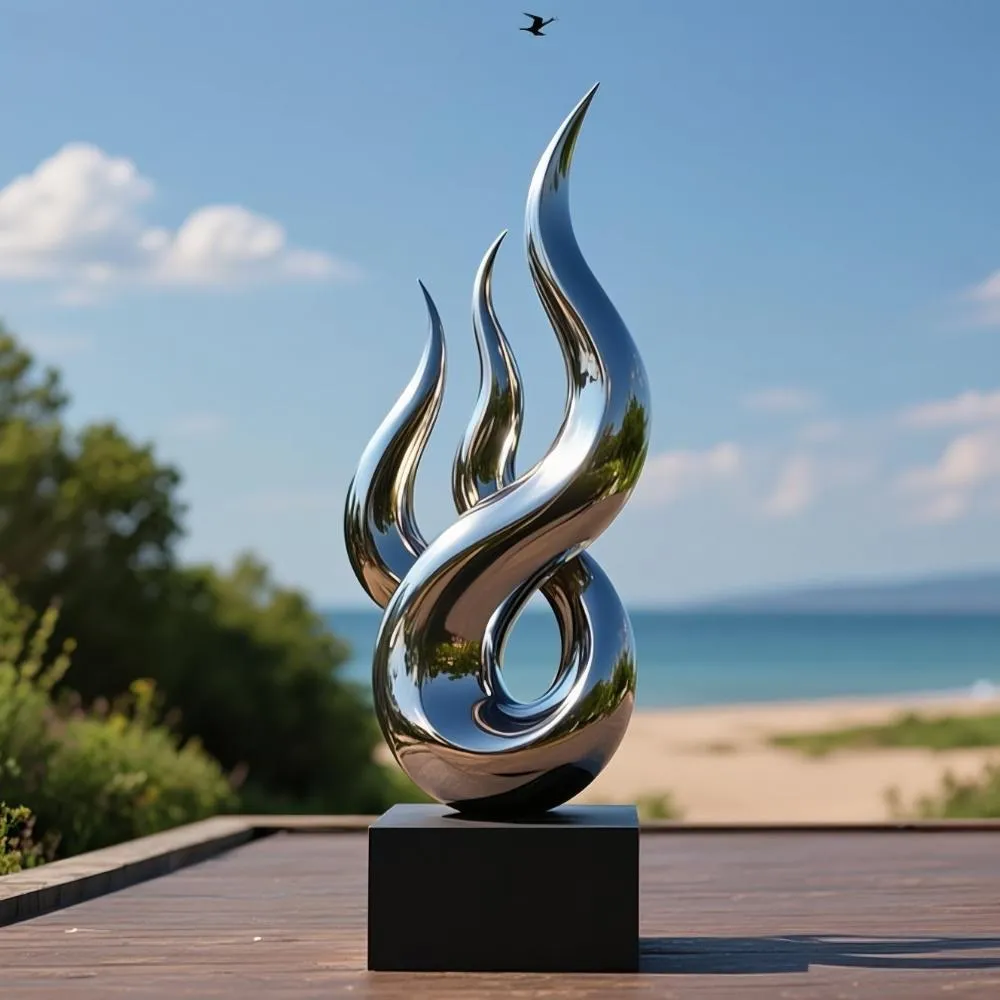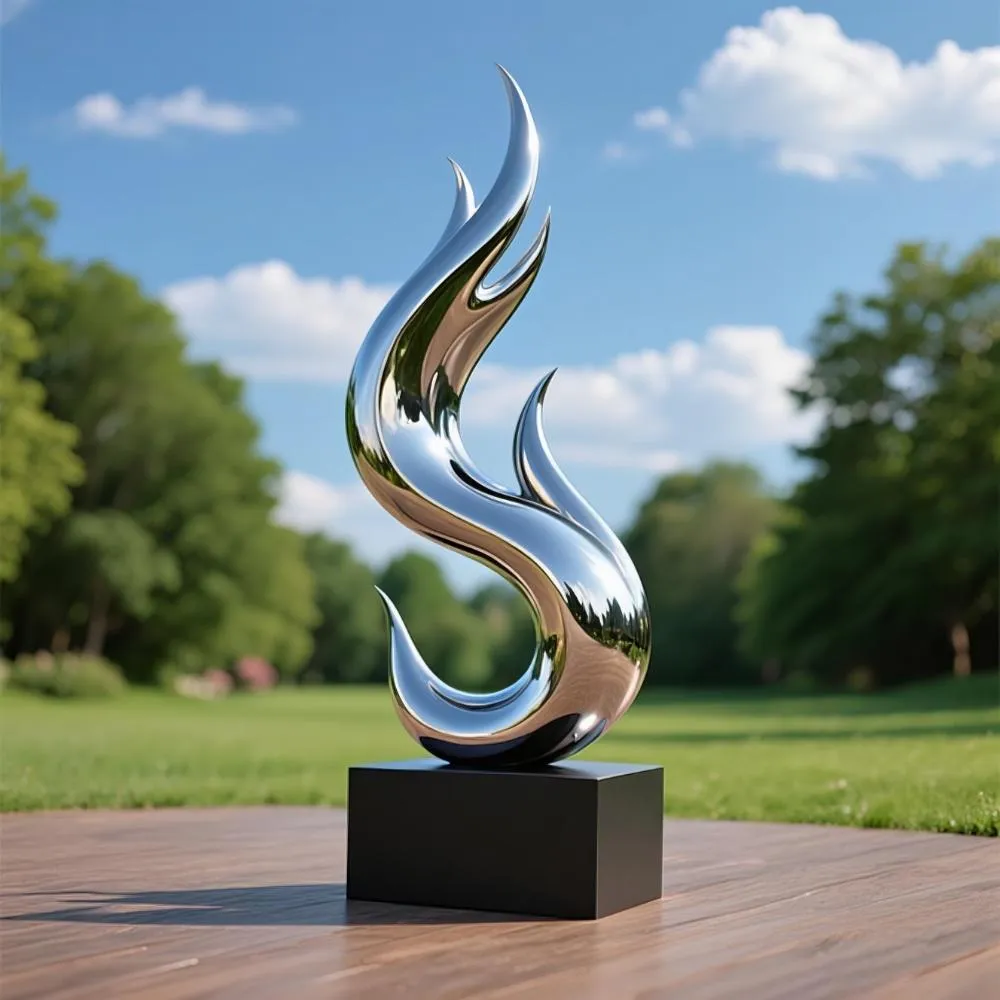 Designed as a stainless steel flame abstract sculpture, this piece elevates outdoor spaces with its sleek, reflective form. It integrates well with: