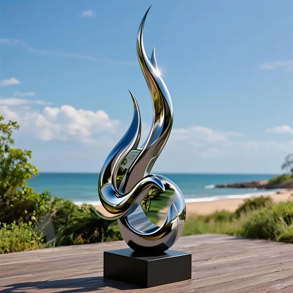 Inspired by the flowing form of fire, this flame abstract sculpture brings powerful visual movement to contemporary landscapes. Its upward curves and dynamic presence evoke elegance and energy, making it an ideal statement piece in gardens, on beachfronts, and in civic installations. Whether viewed under direct sunlight or ambient evening light, the form captures attention and enhances the spatial design.