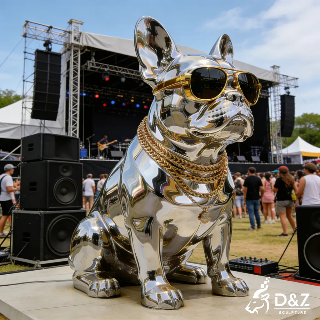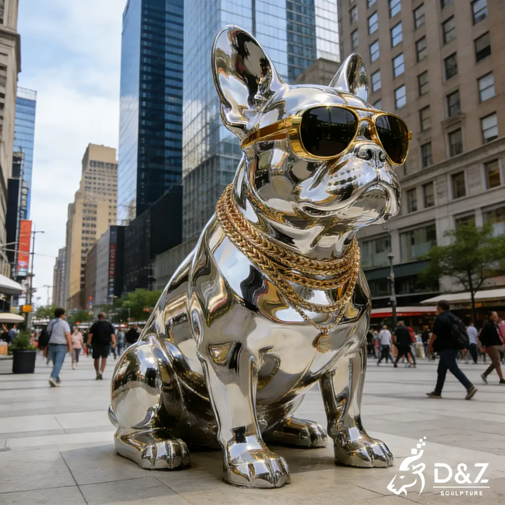 Discover the ultimate statement piece: our luxury chrome French bulldog sculpture, a bold hip-hop-inspired chrome dog statue that fuses pop art energy with street-smart swagger. Crafted by D&Z Art Sculpture, this metal bulldog sculpture features a mirror-polished chrome finish, oversized gold sunglasses, layered gold chains, and a confident sitting pose—perfect for turning heads in any modern space.