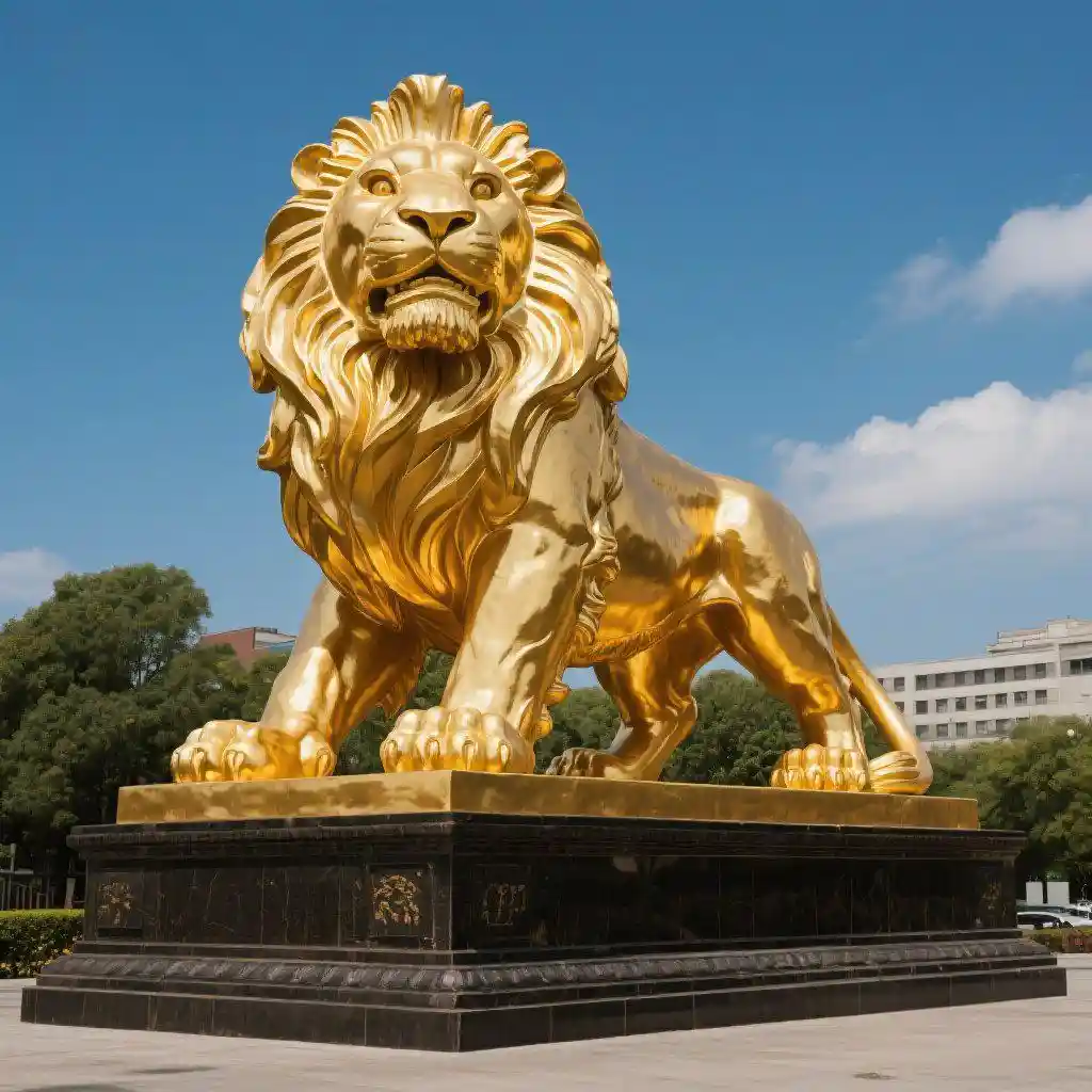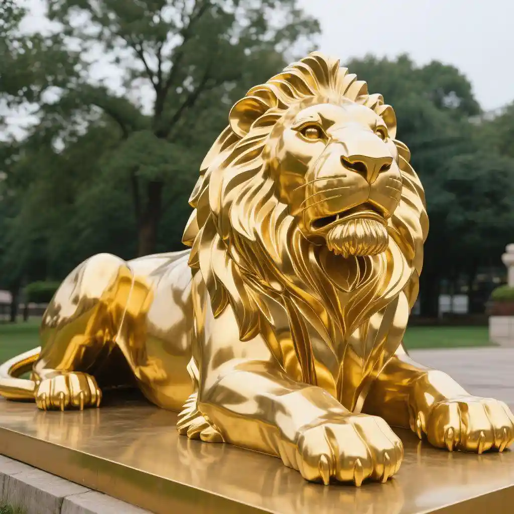 Its golden finish immediately draws the eye. Light dances across the polished surface, enhancing the sculpture’s dramatic effect. Whether placed under the sun or illuminated at night, this golden lion sculpture delivers striking visuals that impress visitors and passersby alike.