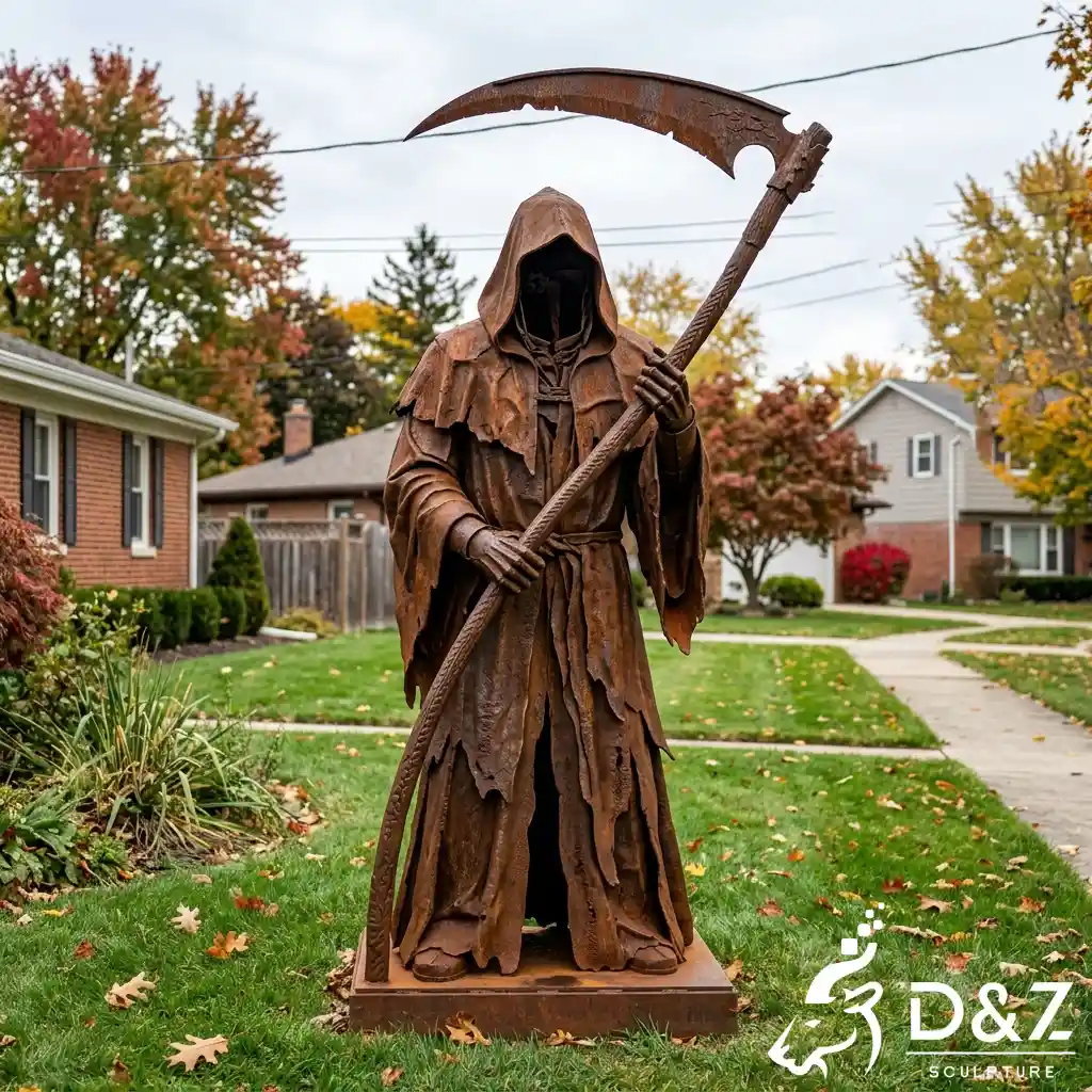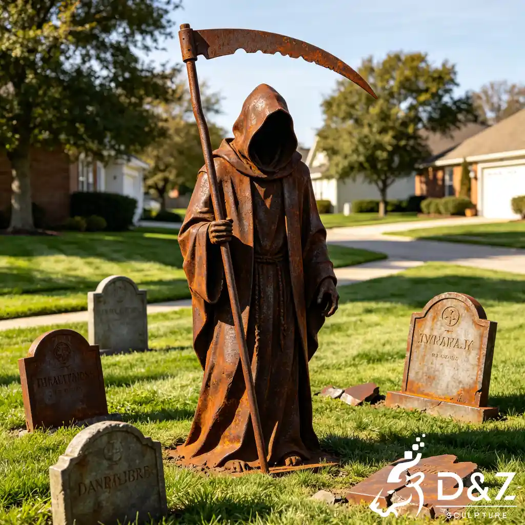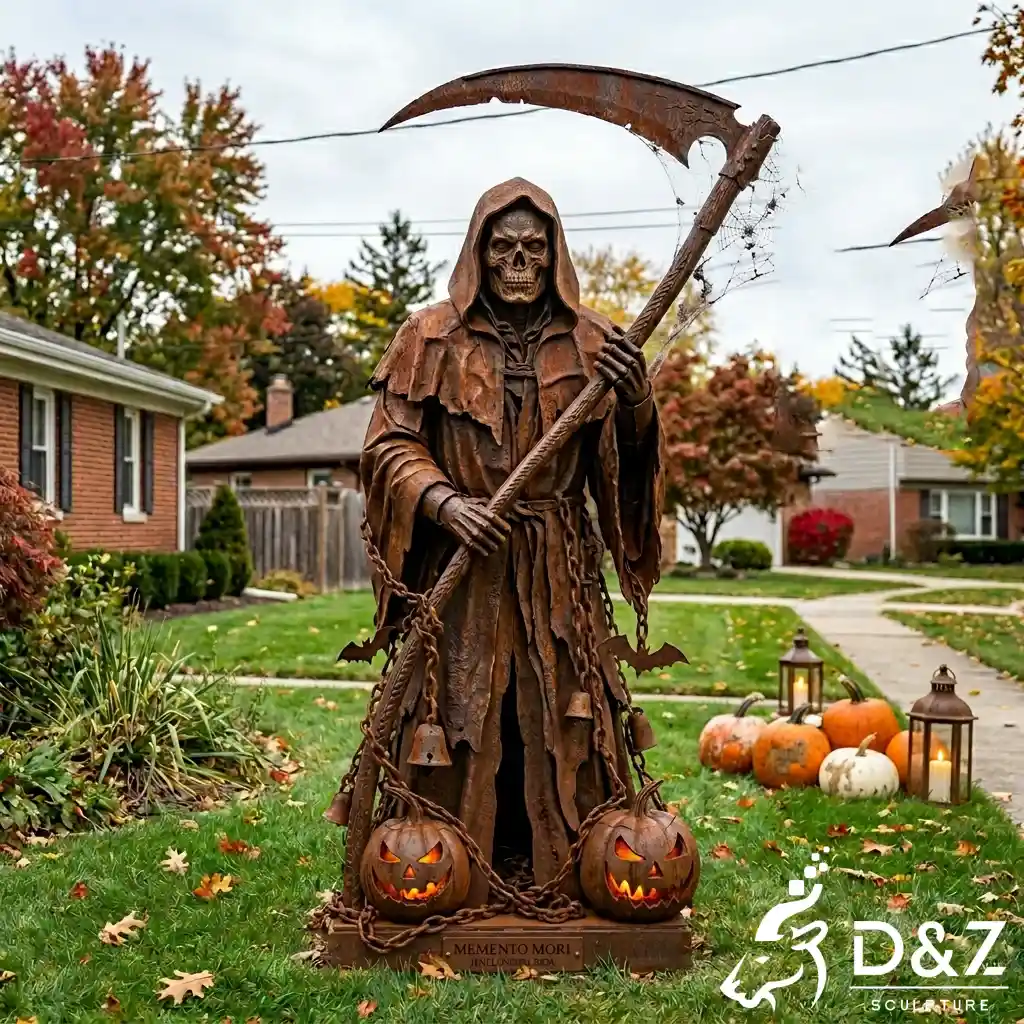 The grim reaper statue’s meaning goes beyond fear—it represents the passage of time, the balance of life and death, and remembrance. The Latin phrase Memento Mori (“Remember you must die”) adds a layer of historical and philosophical depth, making this not just a Halloween sculpture, but a thought-provoking artwork.