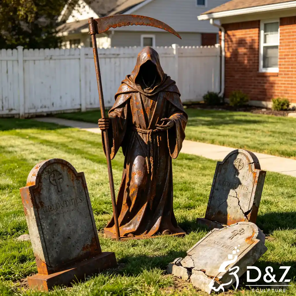 Crafted with a premium Corten steel effect, this large grim reaper statue features a naturally aged rust finish that enhances its haunted cemetery aesthetic. The surface develops a unique oxidized texture over time, making each piece one-of-a-kind.