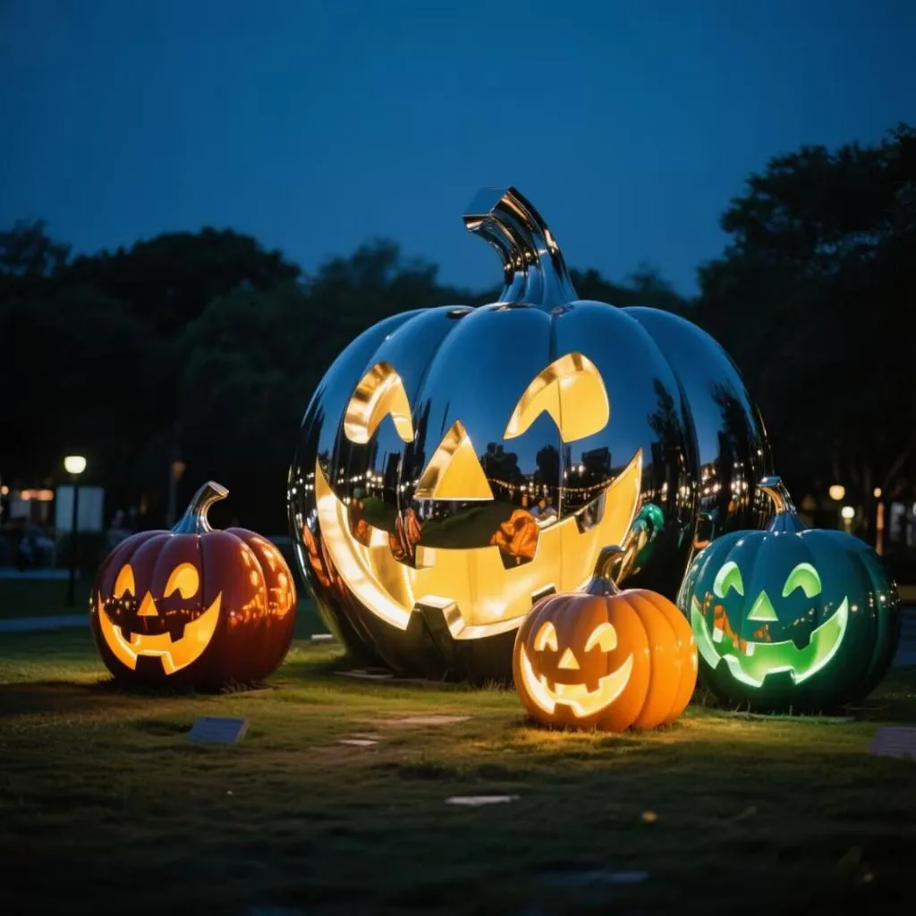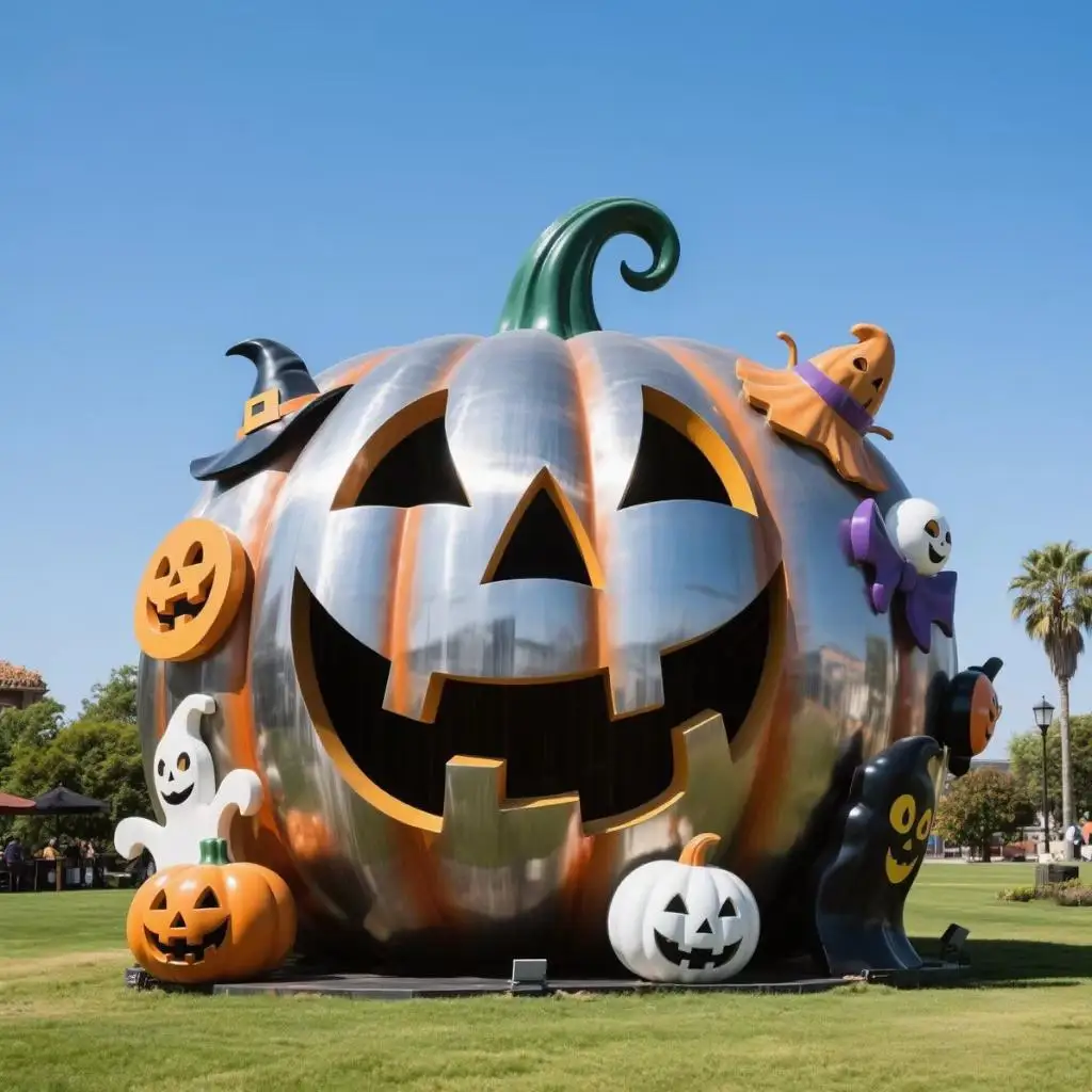 This Halloween pumpkin statue takes Halloween decorations to another level. Crafted from high-grade stainless steel, the giant pumpkin features a glossy finish and rich colors that draw attention both day and night. Its bold form brings energy to outdoor spaces. Whether on a lawn, in a plaza, or along a park path, it quickly becomes the centerpiece of any festive setup.