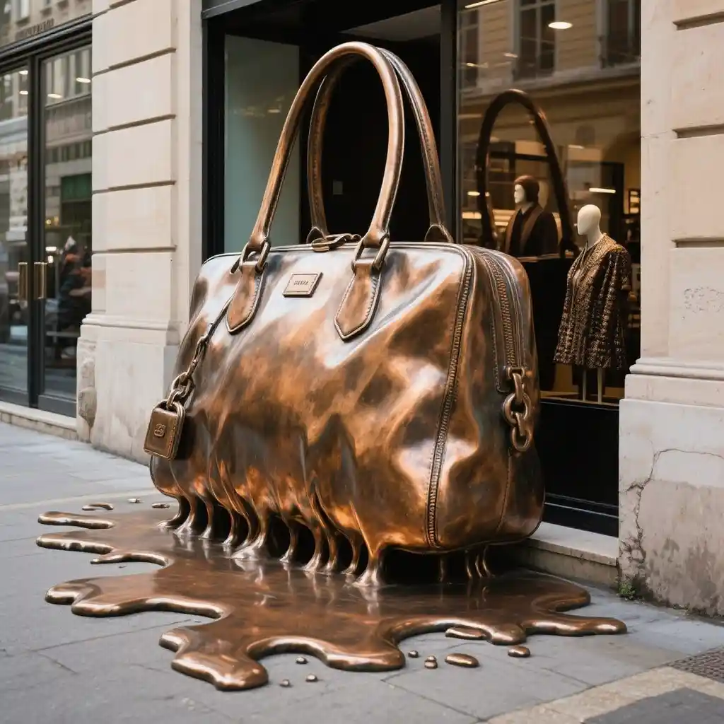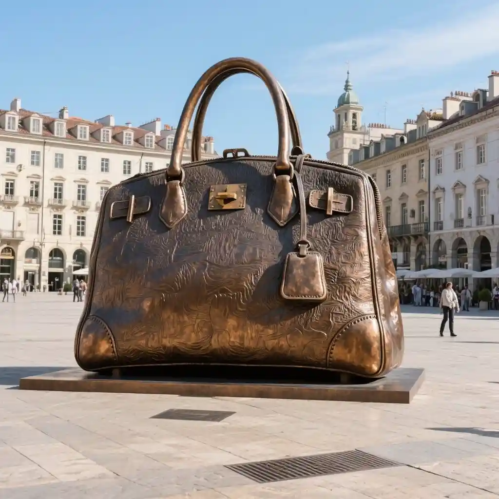 The bronze handbag sculpture functions as a powerful visual anchor and interactive landmark.