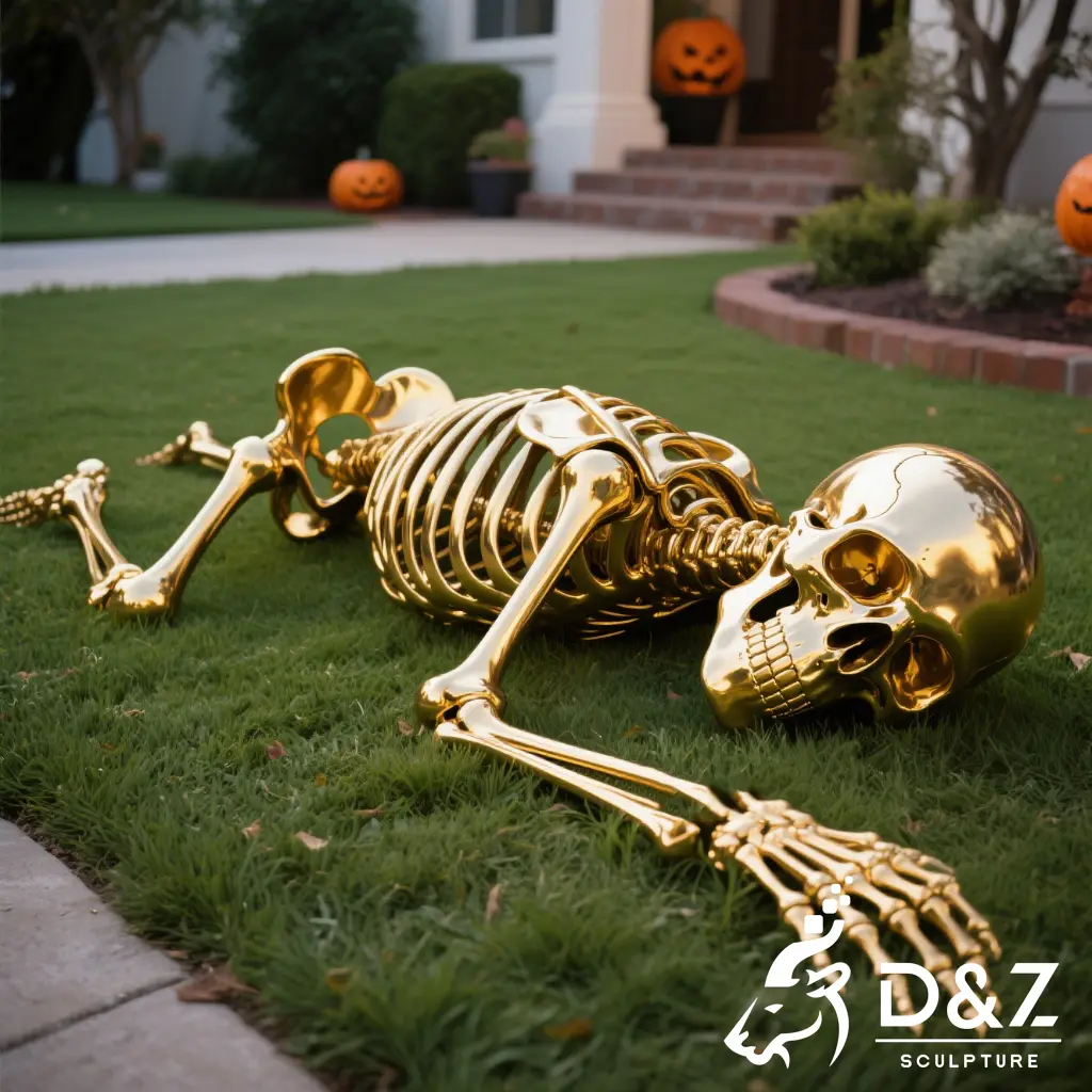 By using a gold finish to represent a skull sculpture and full-body bone structure, the design creates a dramatic contrast—luxury versus mortality. This concept elevates traditional Halloween skeleton decorations into a museum-quality installation. The detailed anatomy, from ribcage to skeleton hand sculpture, enhances realism and artistic value.