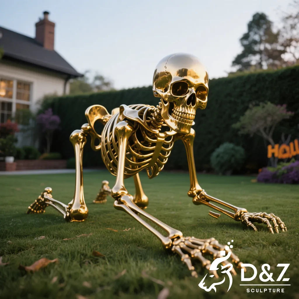 This striking skeleton sculpture reimagines the classic Halloween symbol through a contemporary artistic lens. The crawling pose gives the sculpture a sense of motion and narrative, as if the figure is emerging from the ground.