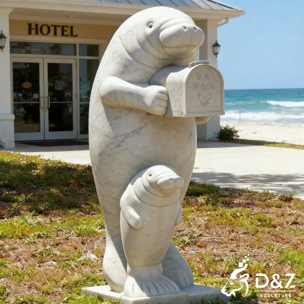 This large manatee statue is expertly crafted from premium marble, designed for outdoor use in coastal gardens, resorts, and hotel entrances. It supports full customization in size, pose, and functional elements such as a manatee mailbox statue, making it ideal for B2B landscaping and branding projects.