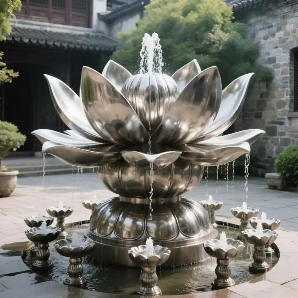 This metal lotus flower fountain stands as both a decorative sculpture and a fully functional water feature.