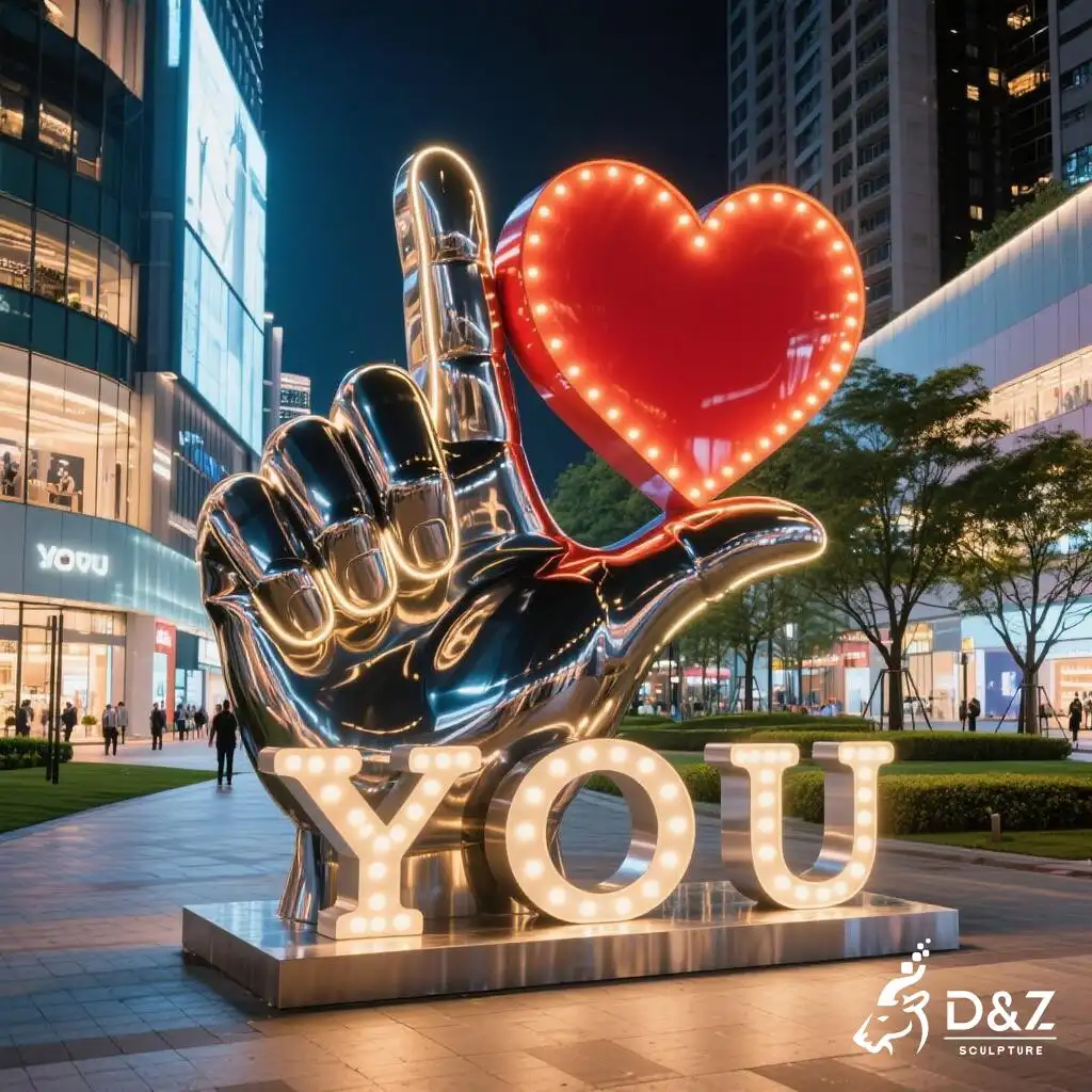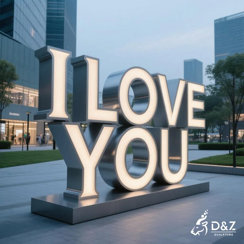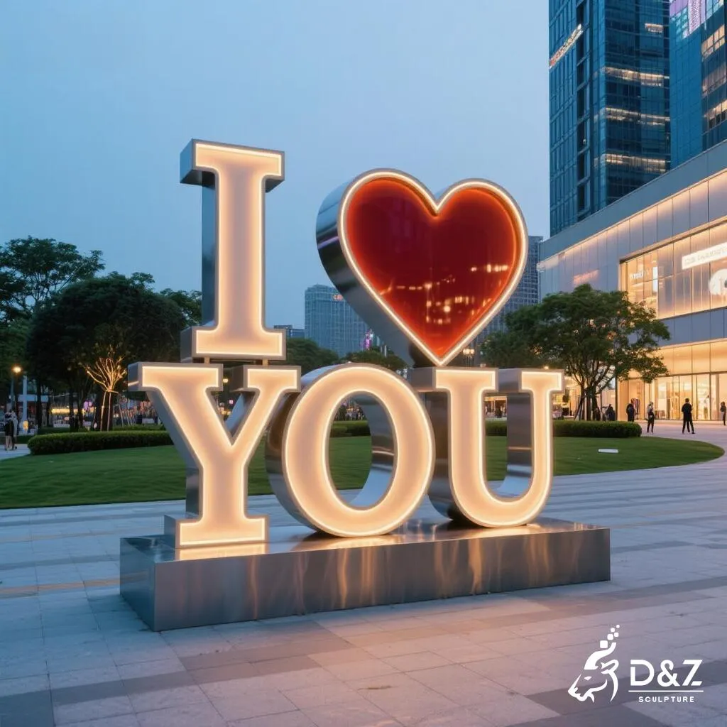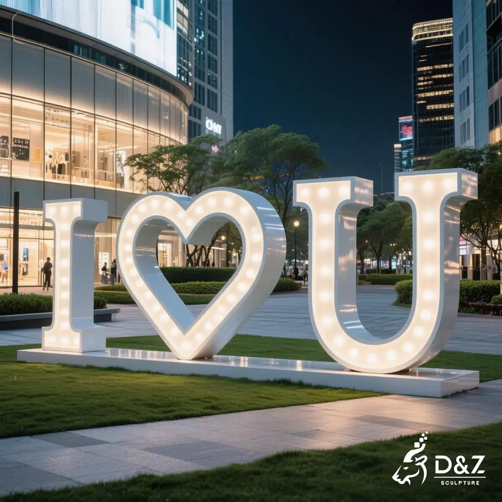 Love speaks louder than words, and our love word sculpture turns that message into a bold visual statement. Inspired by modern city romance and designed for public interaction, this illuminated artwork delivers emotion, beauty, and marketing power. With its glowing “I LOVE U” design, it attracts visitors, encourages photos, and brings a heartfelt atmosphere to any luxury outdoor space.