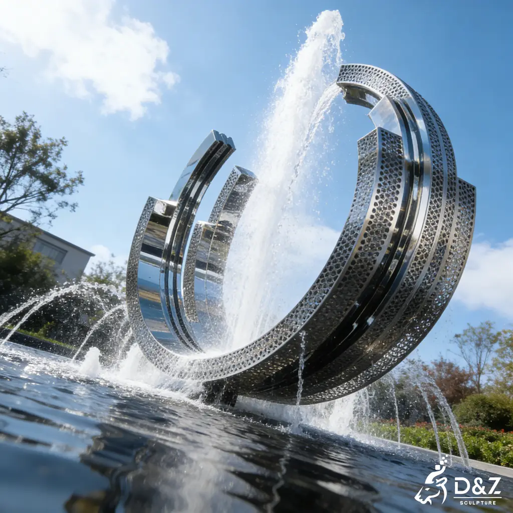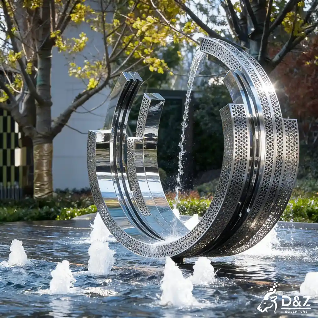 At the core of this stainless steel arc welding sculpture lies a philosophy of balance, movement, and contemporary expression. The layered arc structure symbolizes continuity and energy, while the thin stream of water falling through the center creates a poetic interaction between sculptural solidity and fluid motion. The design draws inspiration from modern minimalism, where clean geometry becomes a calm yet powerful presence in any landscape.