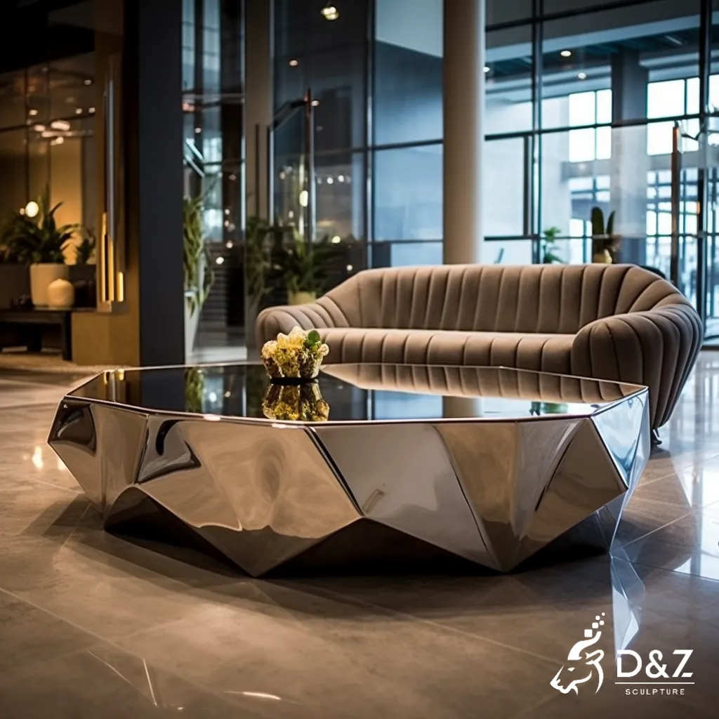 Every metal art table from D&Z Art Sculpture is made using 304 stainless steel, known for its durability and corrosion resistance. The surface is hand-polished and coated with plating or painting for a luminous finish. Skilled artisans manually weld, grind, and polish each angle to ensure precise reflections and seamless edges.