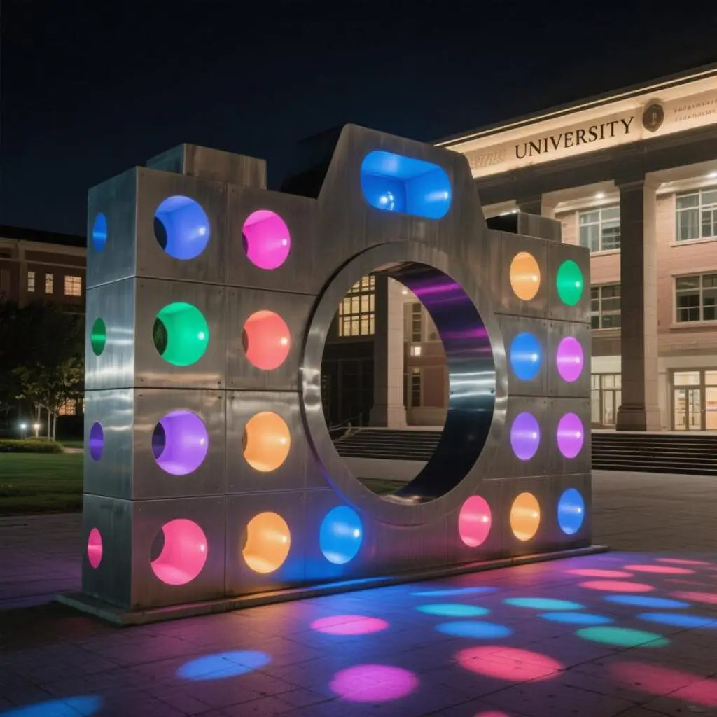 Engineered for outdoor display, the metal camera sculpture is constructed from industrial-grade materials.
