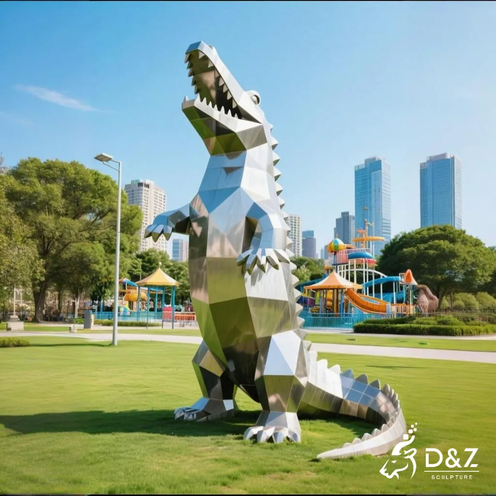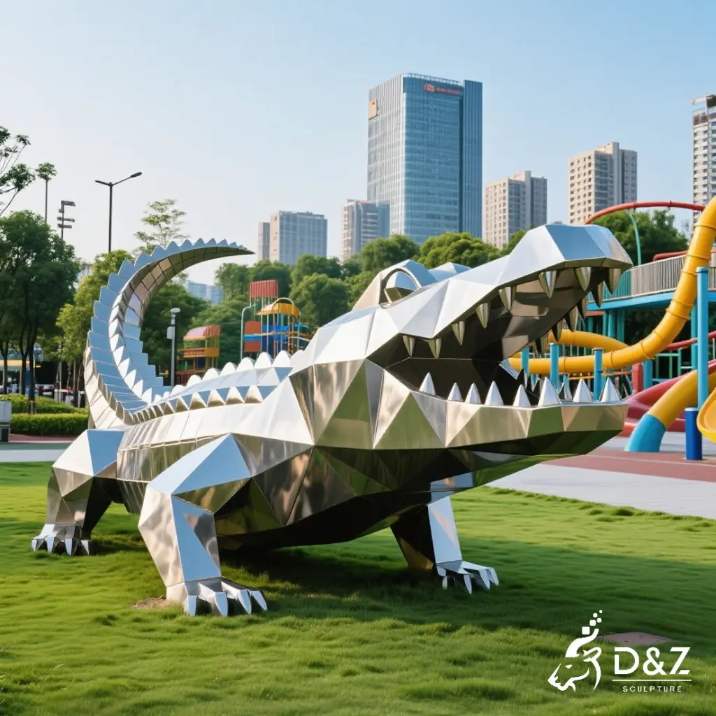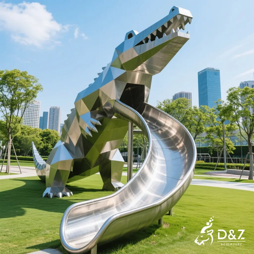 This crocodile sculpture stands out with its bold, angular geometric design. Whether it’s the upright, jaw-snapping stance (like the iconic piece in lush parkscapes) or the low-slung, powerful crawl (perfect for grassy play areas), each variant boasts sharp polygonal edges and a polished metal finish. Some designs even integrate stainless steel slides (see the dynamic sculptures with winding slides), turning it into a must-play playground animal sculpture that kids and families adore. From abstract geometry to semi-realistic details (like the scaled, lifelike crocodiles), there’s a style to match every vision.