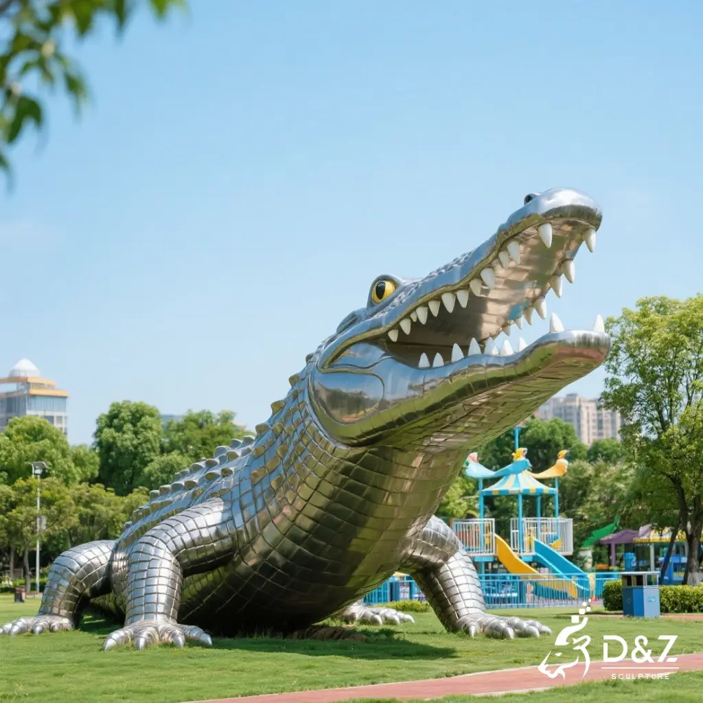 Crafted from premium stainless steel, this metal crocodile sculpture is corrosion-resistant, durable, and suitable for long-term outdoor display. The mirror-polished surface reflects its surroundings, integrating the sculpture naturally into any landscape.