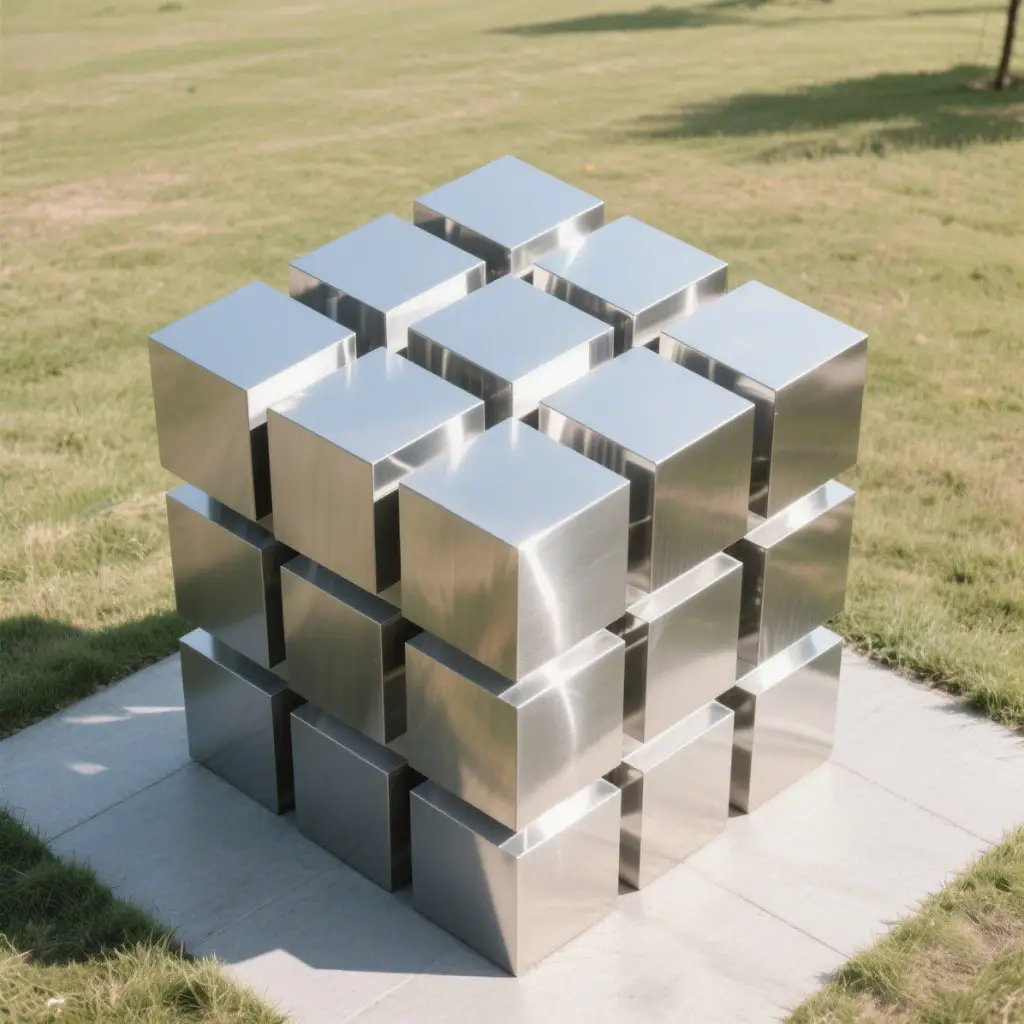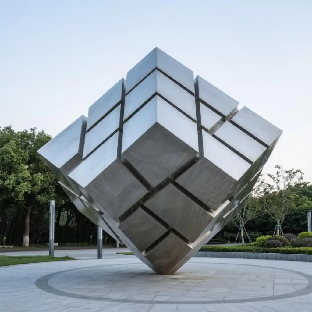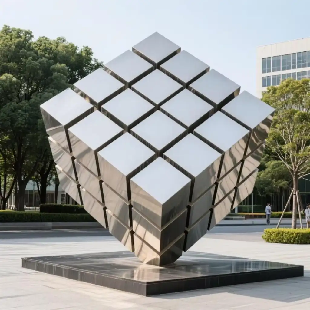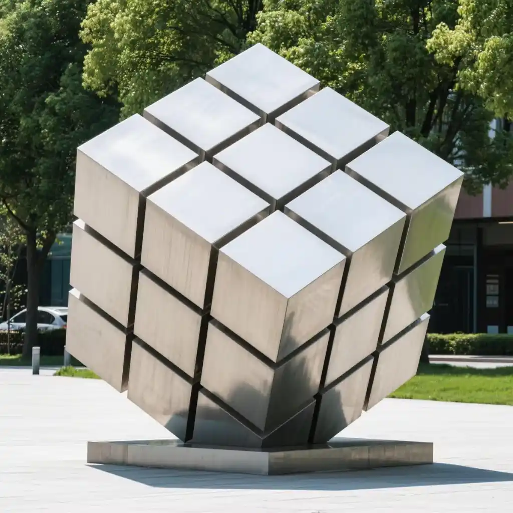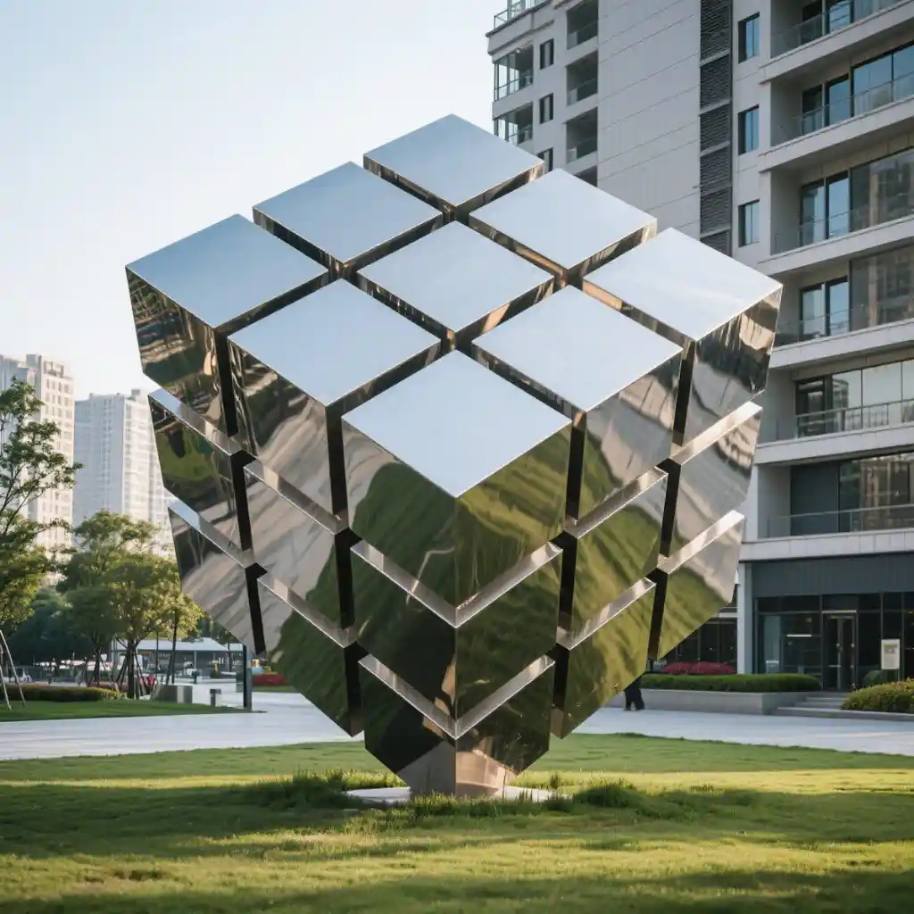 Crafted from high-grade 304 or 316L stainless steel, this metal cube sculpture stands strong against rain, snow, UV rays, and coastal environments. Whether placed in seaside cities, tropical climates, or cold regions, it remains shiny, stable, and elegant. Its mirror-polished surface not only enhances visual appeal but also resists stains and dust, ensuring this modern stainless steel sculpture shines season after season with minimal upkeep.
