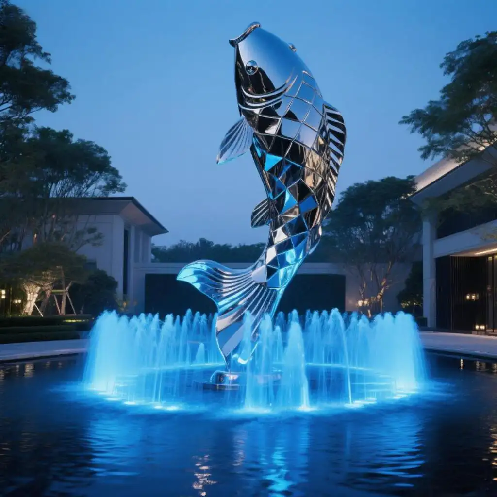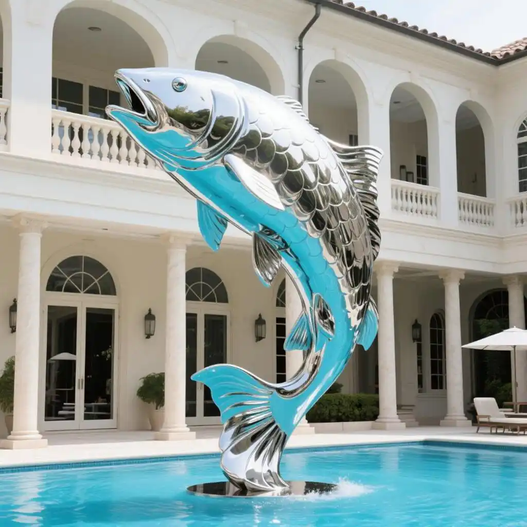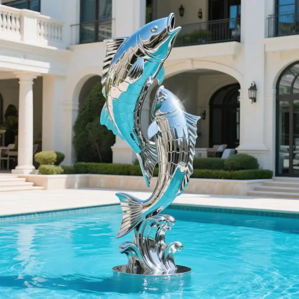 The mirror-polished metal fish sculpture is a dynamic centerpiece designed for modern water features and outdoor luxury spaces. Its leaping posture and reflective finish bring movement, elegance, and visual drama to high-end landscapes.