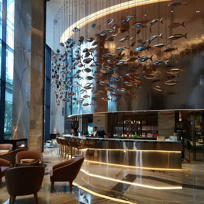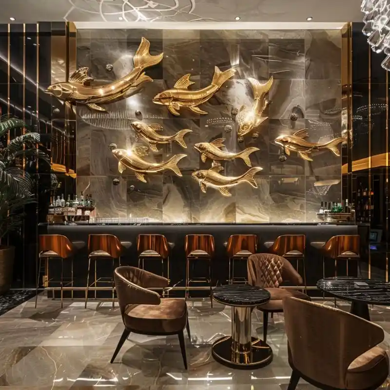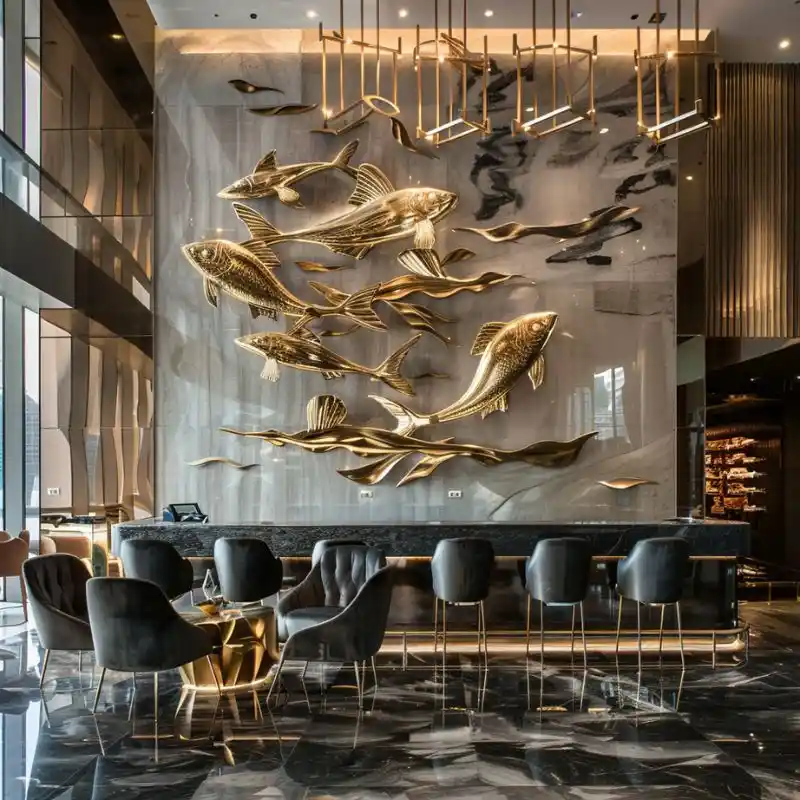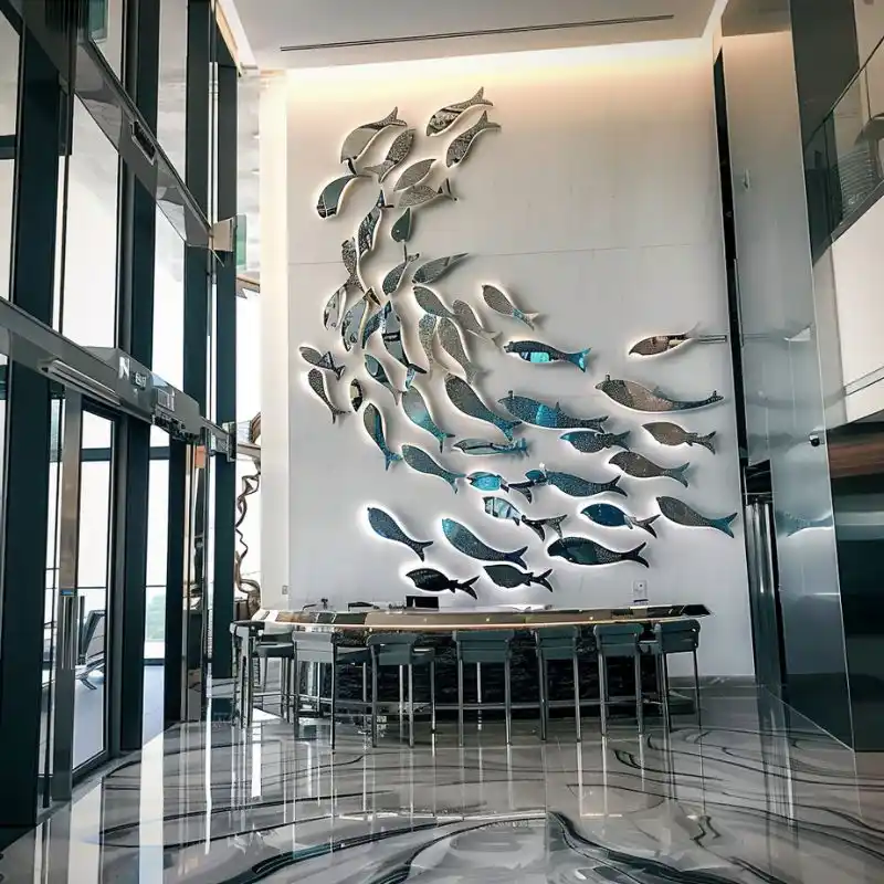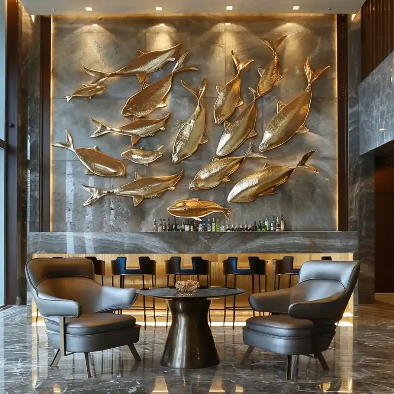 Every space has its character. That’s why we offer full customization for our metal fish wall sculpture. You can choose different sizes, colors (gold, silver, brushed steel, etc.), and arrangements. We work closely with designers, architects, and property owners to tailor each sculpture to their vision.