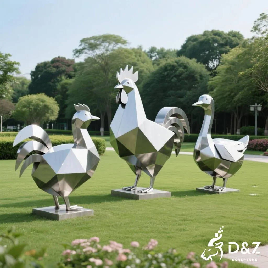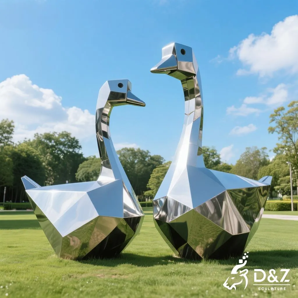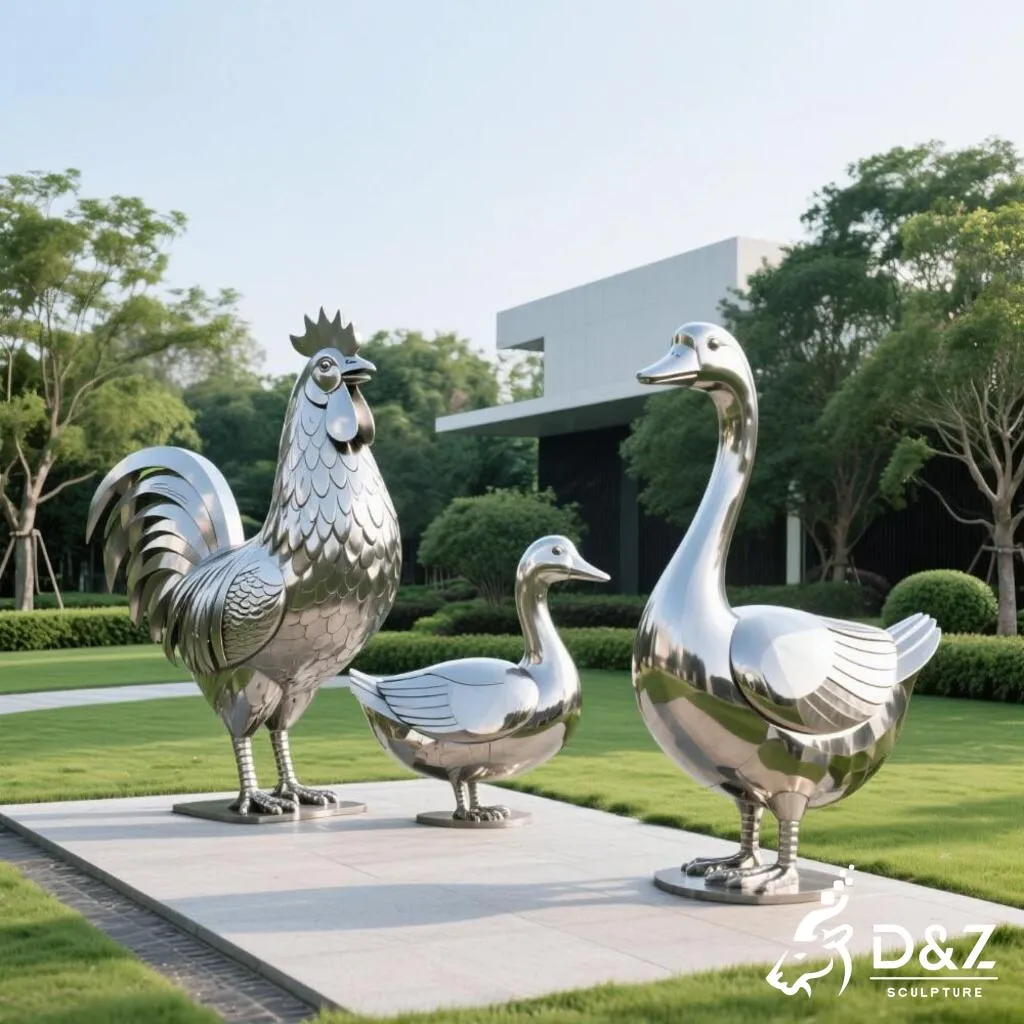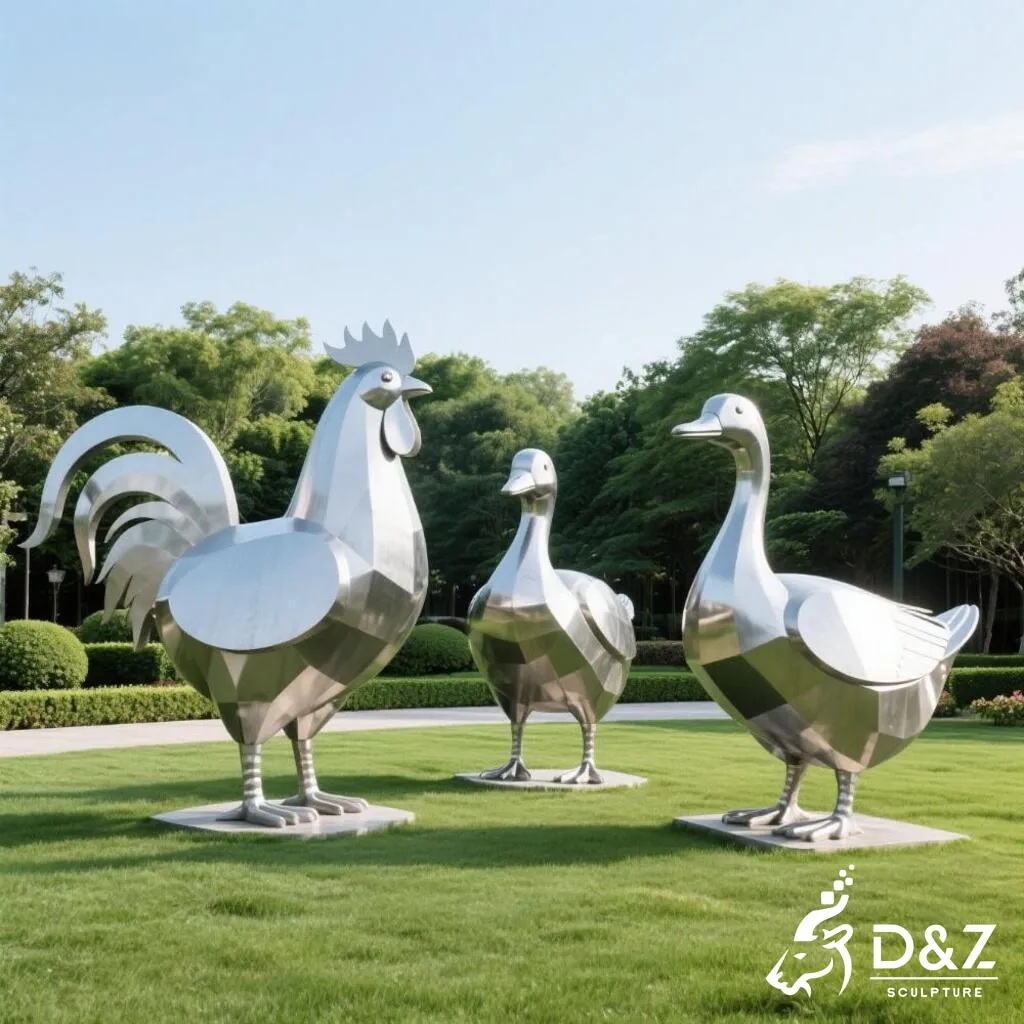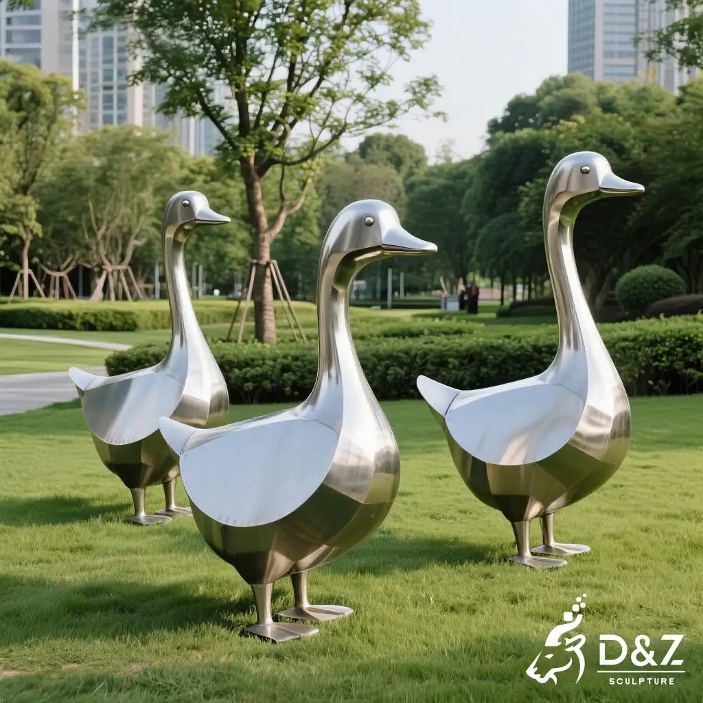 Add playful life to gardens and parks with this stainless steel goose garden statue with chicken and duck. Modern style, outdoor-ready, customizable. Reach out today: