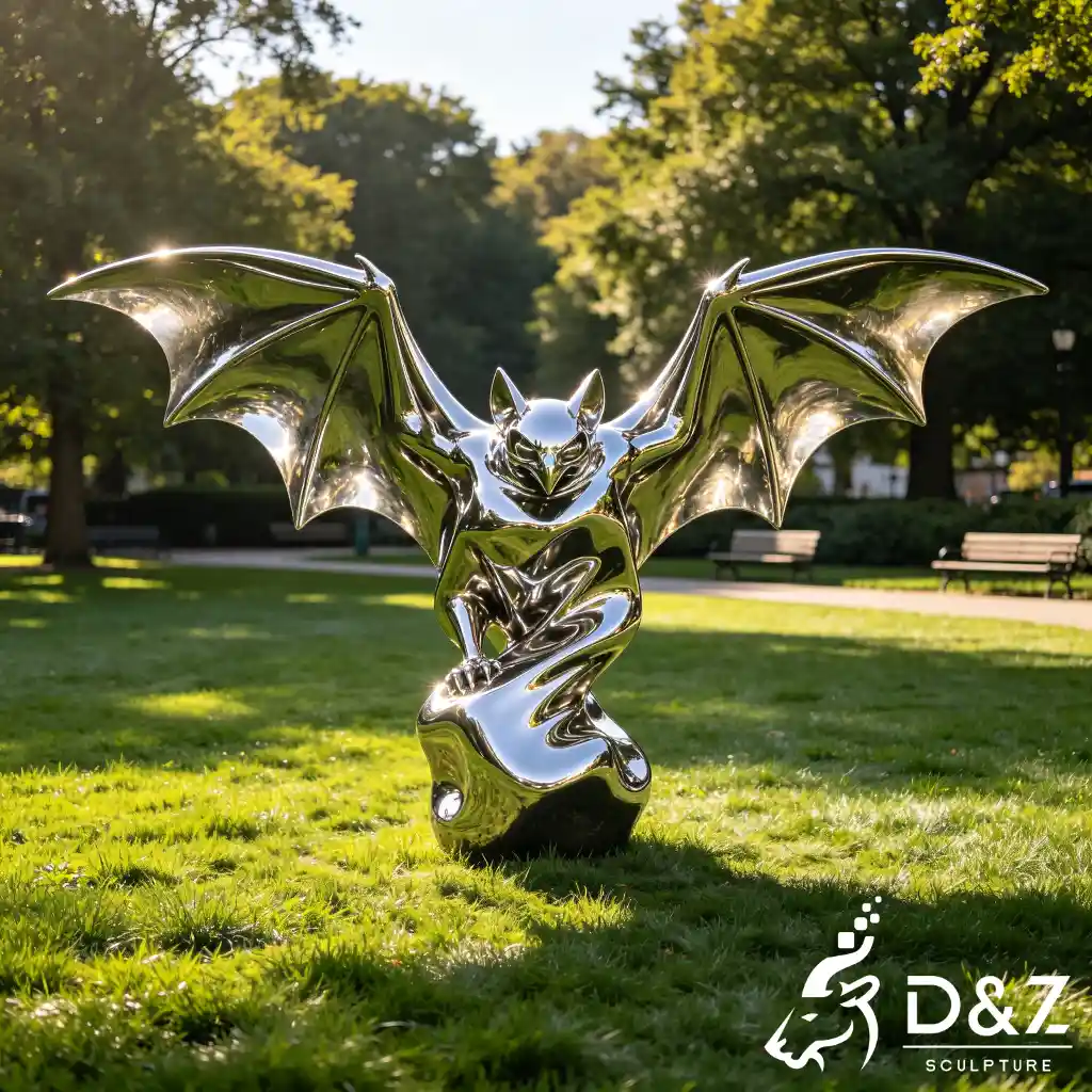 Each bat metal sculpture is sculpted with anatomical precision—sharp claws, stretched wing membranes, and fluid body curves—while maintaining an abstract modern aesthetic. The mirror-polished surface reflects the surrounding landscapes, making the sculpture appear alive within its environment.