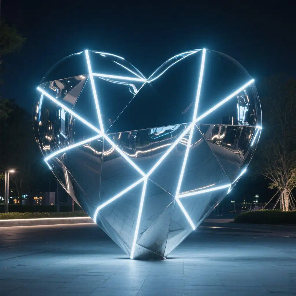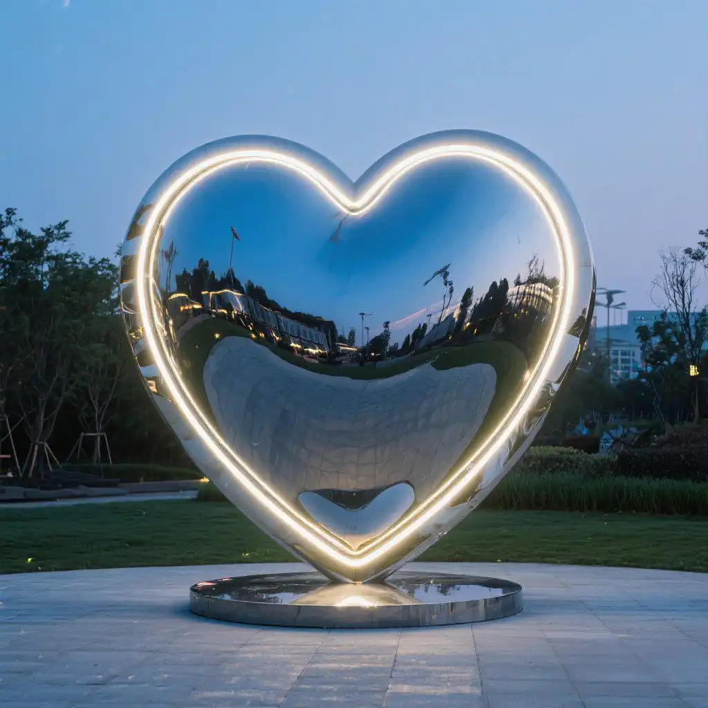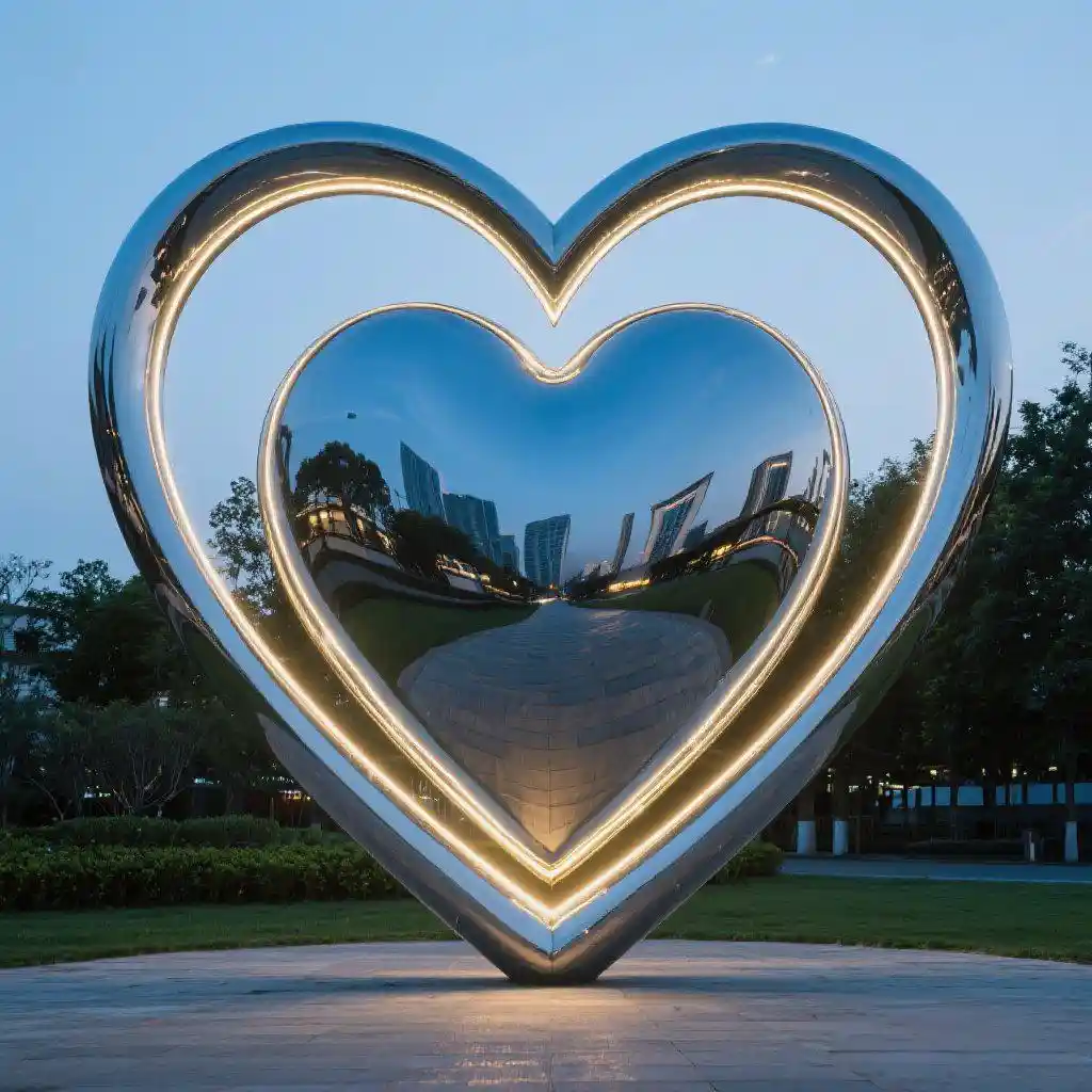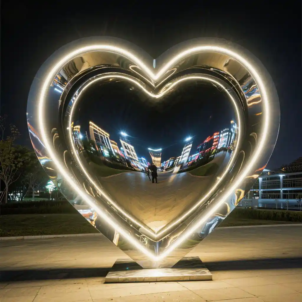 Crafted from premium-grade stainless steel, the metal heart sculpture resists corrosion and stands strong against the elements, making it perfect for long-term outdoor use. Its smooth, mirror-polished surface reflects sunlight during the day, while the built-in LED system softly illuminates it at night. The result is a romantic art sculpture that glows with warmth, inviting onlookers to pause, reflect, and feel inspired.
