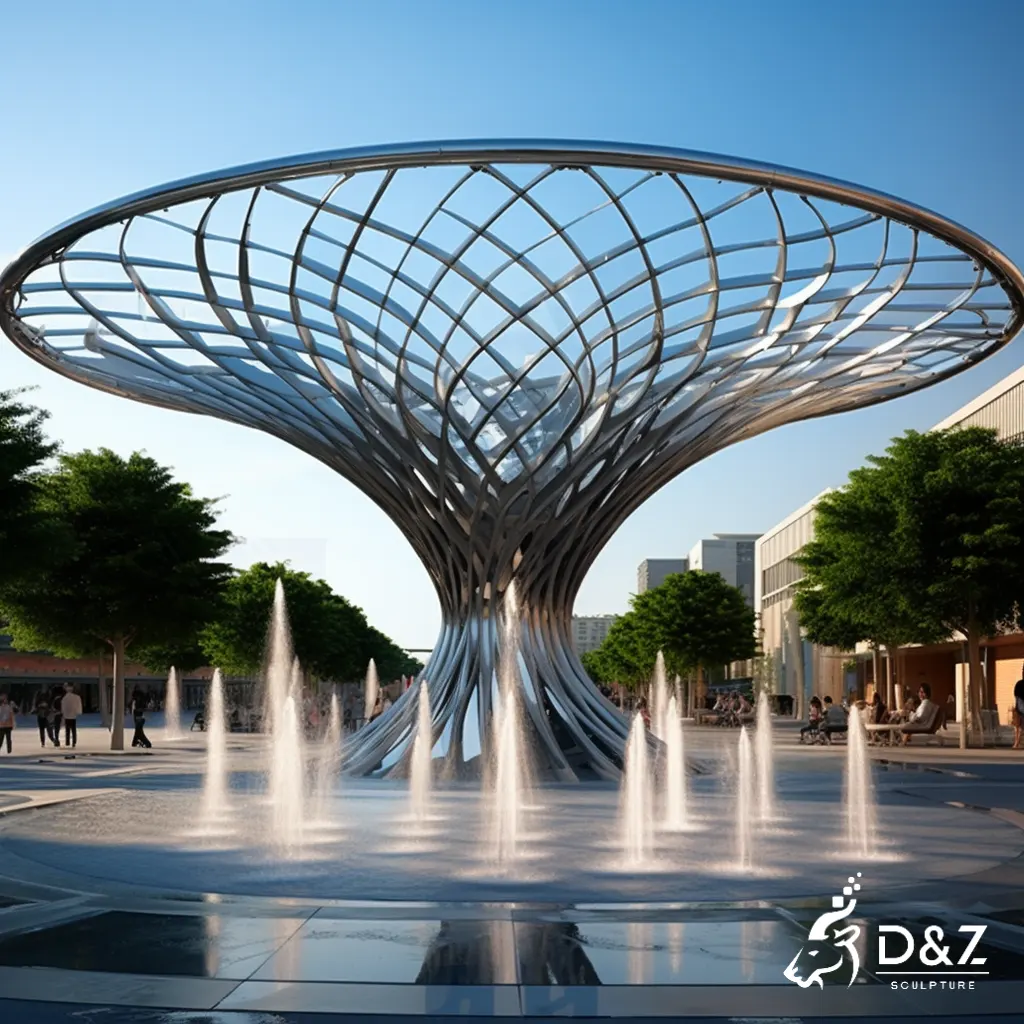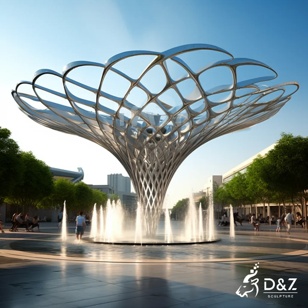 The fountain features an intricate metal mesh sculpture resembling a blooming canopy. Its hollow grid design creates mesmerizing light-and-shadow interplay, while curved stainless steel strips radiate outward. A circular basin sends water jets arching upward, catching sunlight to form rainbow prisms.